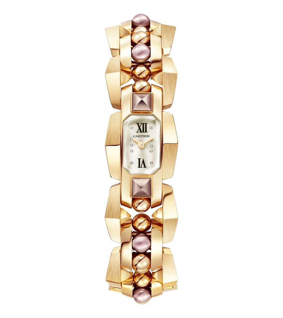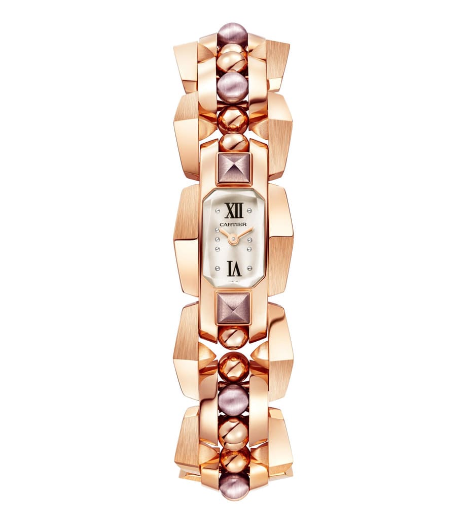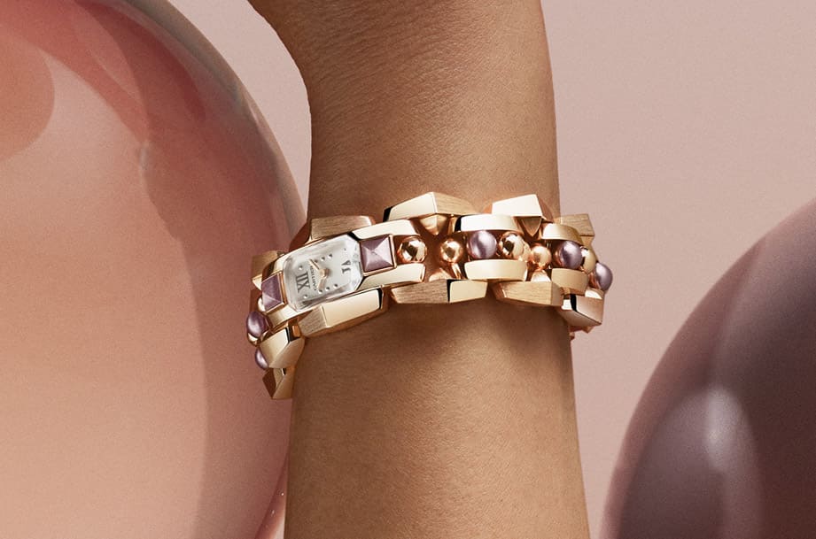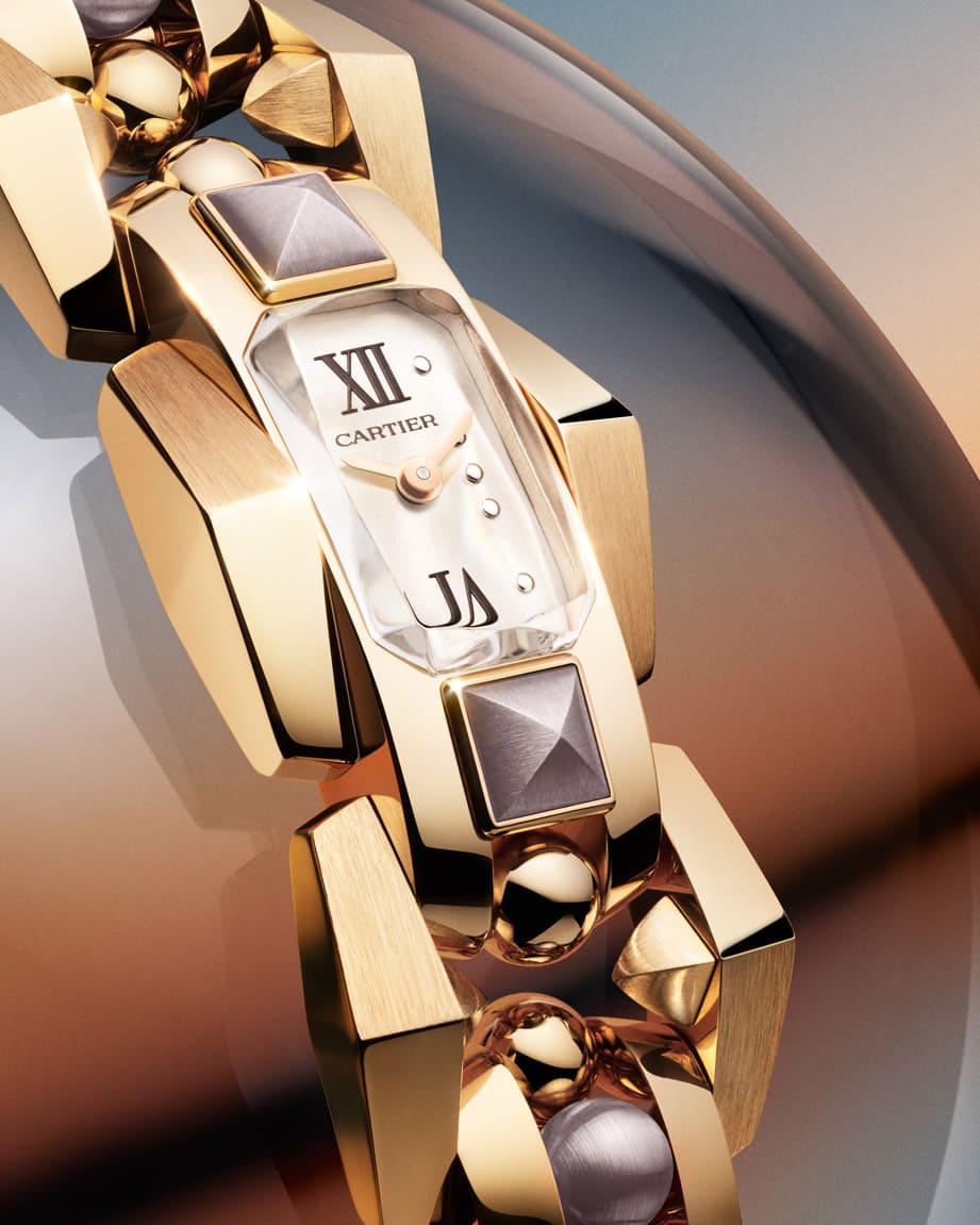 錶款的K金錶殼交錯使用磨砂和拋光處理,包括黃金和玫瑰金款還可以見識到卡地亞獨家研發的紫金,其能散發有別於傳統金屬的淡紫色光澤,並廣泛分佈在手錶錶殼與錬節上的圓珠和巴黎飾釘等零件,與黃金或玫瑰金材質相映生輝,即使沒有鑽石或寶石點綴,手錶外觀的吸引力依舊強烈。