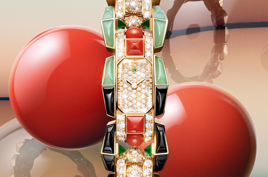 ▲透過珊瑚、黑色尖晶石、綠玉髓等寶石鑲嵌,賦予手錶繽紛多彩的形象。