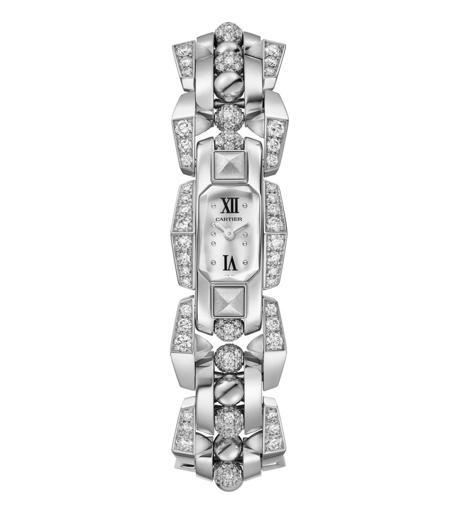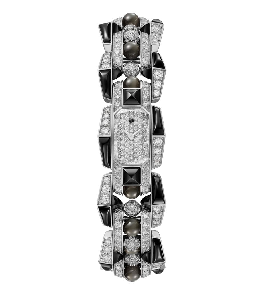 ▲錶殼、錬節乃至藍寶石鏡面都有立體切面,彼此相輔相成,同時手錶以圓珠、飾釘和巴黎飾釘串連的設計更是獨樹一幟。