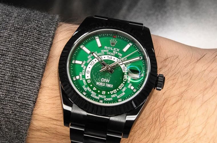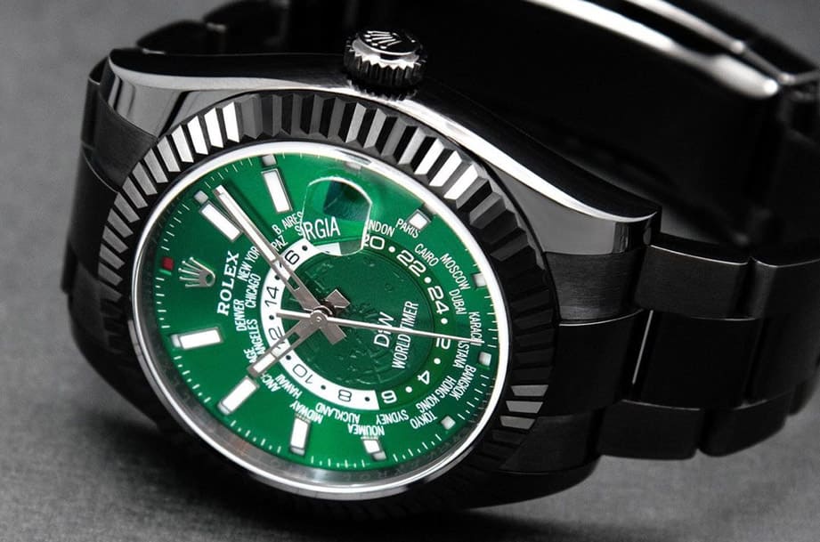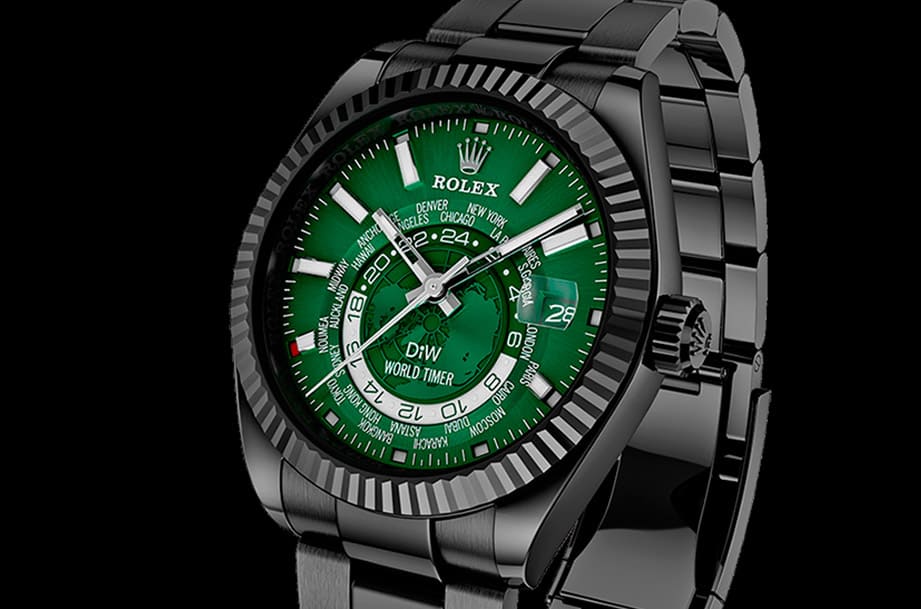 DiW的Sky-Dweller Black DLC Green大致維持了原廠設計的精髓,但是針對兩地時間顯示方面,他們認為手錶還有再進化的空間,於是可見原本的24小時轉盤外側增設了代表24個時區的城市環,同時24小時轉盤也改為綠白雙色樣式,如此一來兩地時間顯示便就地昇華為世界時區顯示,錶主出國在外,想要知道其他地區的當前時刻便不會侷限於原居地時間,而能一手掌握全球各時區的脈動。