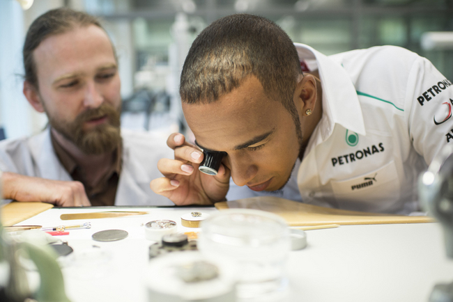 ▲ 路易斯.漢米爾頓觀摩製錶師精湛的製錶技藝。