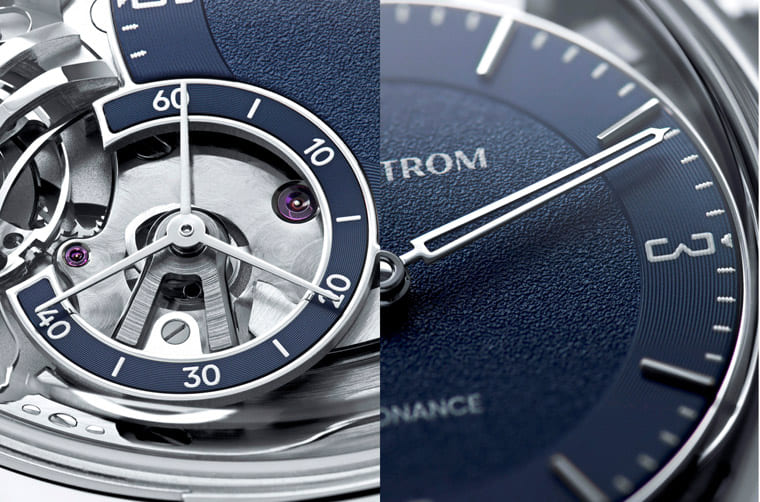 Mirrored Force Resonance藍色精工版依舊擁有特色的雙擒縱系統,面盤有一半的空間採用開面設計,露出機芯的正面組件,面盤右半邊為藍色偏心錶盤,其中間地帶以粒紋處理搭配外圍刻度的同心圓緞面磨砂修飾,營造出具有層次變化的效果。