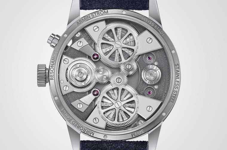 通常這種結構較複雜的手錶會令人擔心其耐用性,但是Armin Strom反而打破刻板印象,使其比標準機芯的抗衝擊效果更優異,確保手錶能夠日復一日維持在高精準走時狀態。錶背透明底蓋能夠讓人一窺品牌獨立研發ARF21手上鍊機芯的模樣,其主機板上費心地鐫刻上許多文字,內容和Mirrored Force Resonance的特性有關,而包括雙發條盒與橋板的佈局等,也都再度強調其講究對稱設計的用心。至於手錶所謂「精工版」之意,從零件上所具備的魚鱗紋、緞面打磨、倒角和拋光技術等細節可見一斑,特殊的複雜機芯結構在精細的加工修飾下更感迷人,嶄新搭配藍色點綴後,手錶的吸睛功力比起前作因而達到青出於藍的新境界。