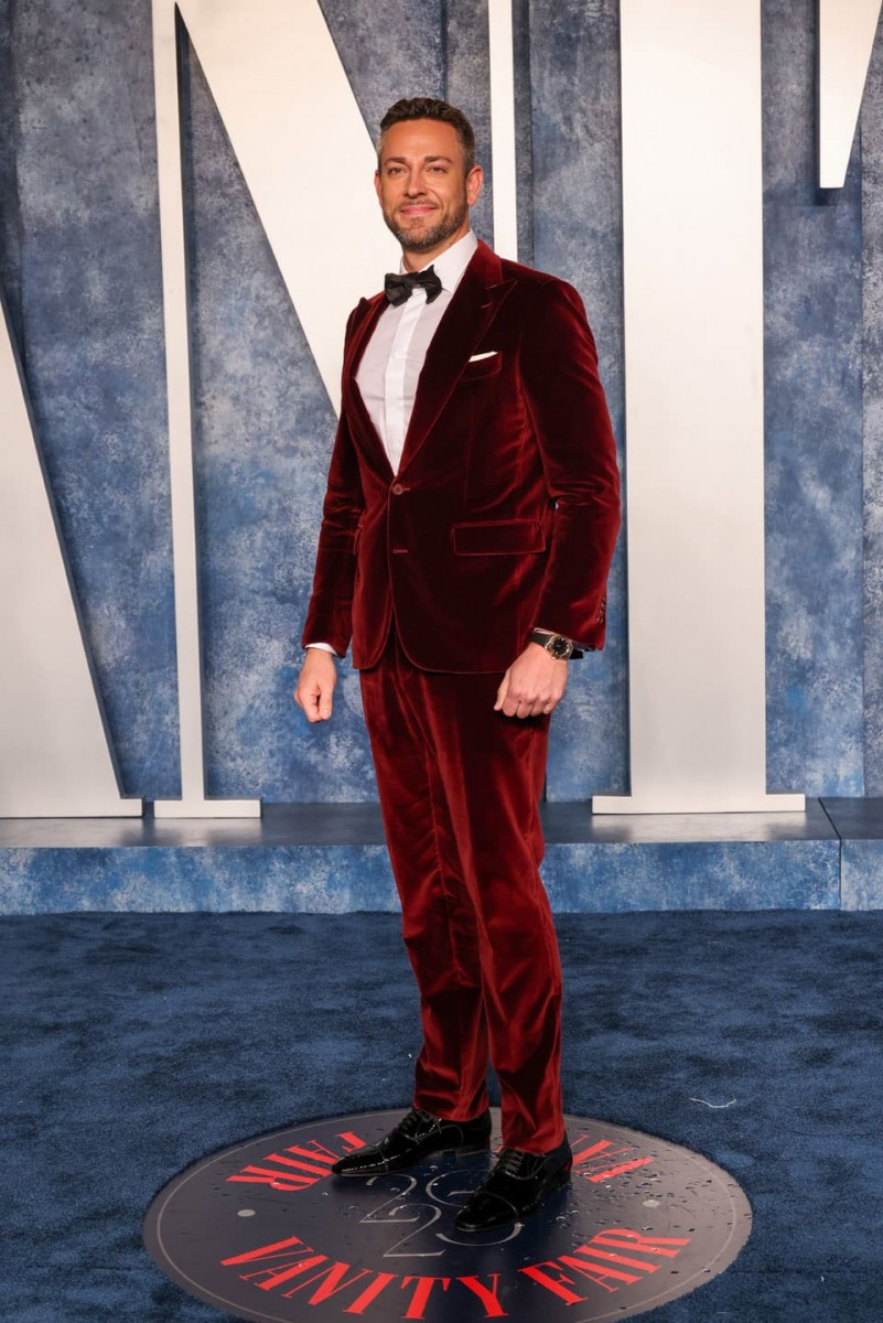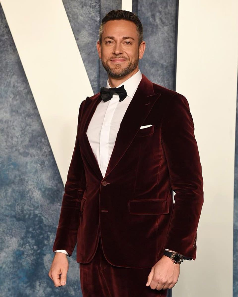 ▲Zachary Levi在奧斯卡獎上佩戴宇舶經典融合系列手錶搭配他的酒紅色絨質西裝。