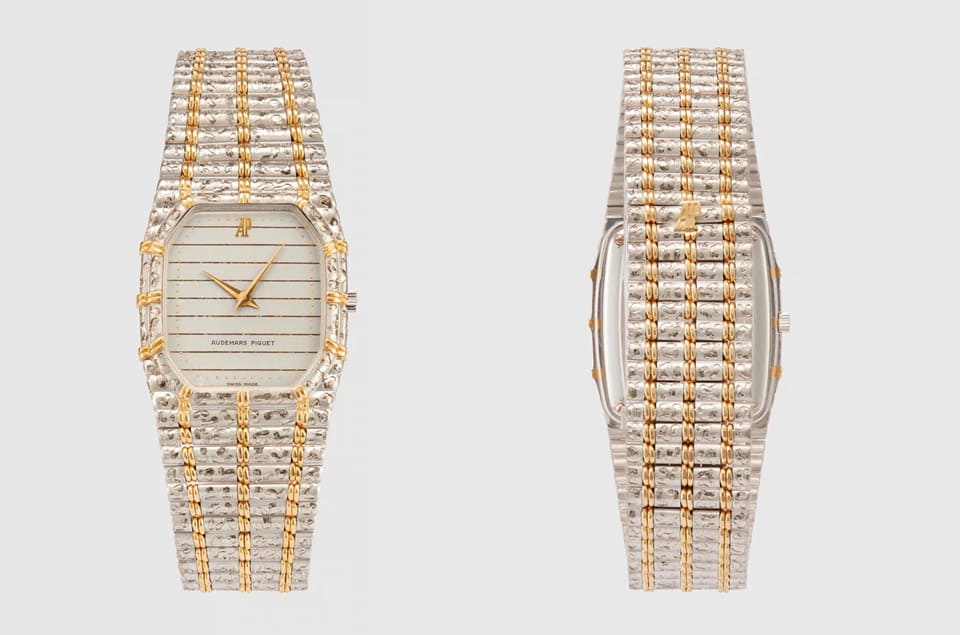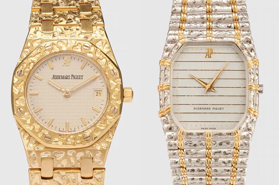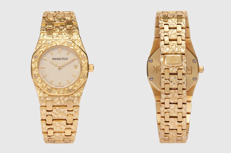 ▲另一款同為PATCHARAVIPA改裝的黃金皇家橡樹石英錶,外觀同樣經過敲捶處理,展現獨特視覺魅力,要價NT$ 1,543,000。Source:doverstreetmarket