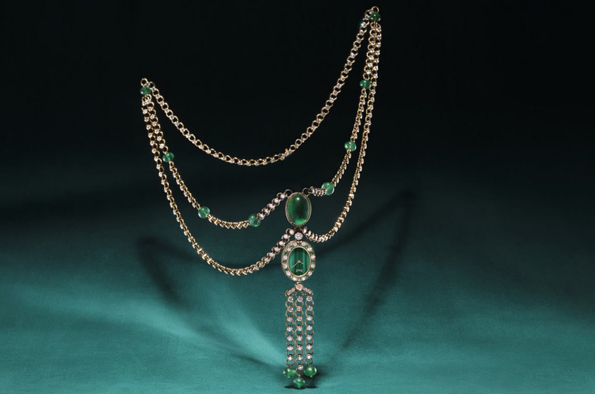 在這看似項鍊的作品中,實則隱含時間的足跡;伯爵在製作項鍊的過程時,需先將纖細的金絲捲成線圈,再透過工匠手藝將線圈進一步旋轉扭曲成扭圈,然後品牌會將一枚一枚的扭圈組裝成項鍊的鍊條,要順利製成具有項鍊造型的作品至少需要超過130個工時,由於工匠在以手工製作扭圈的過程中肯定會有細微的差異,所以每款Swinging Sautoir項鍊錶都是唯一的存在,突顯其珍貴稀有的工藝價值。系列中最搶眼的作品要屬孔雀石面盤、項鍊鑲有一顆凸橢圓形贊比亞祖母綠主石的獨一無二款式,而且光是在面盤周圍部分就精心鑲上數顆鑽石與祖母綠,後者與孔雀石的顏色彼此呼應,伯爵貼心地將面盤設計為12點方向朝下,當佩戴者想要看時間只需低頭俯視即可,不需特別將面盤部分抬起甚至轉向,非常方便。
