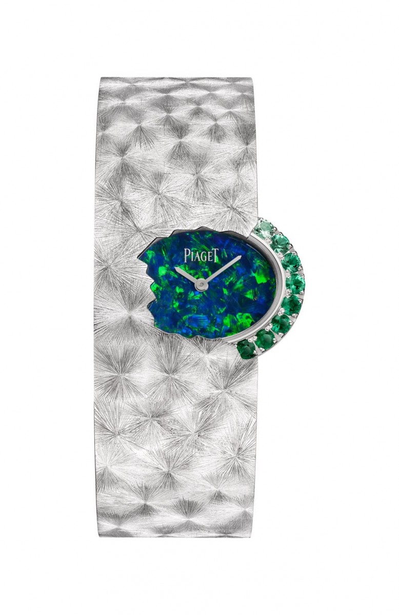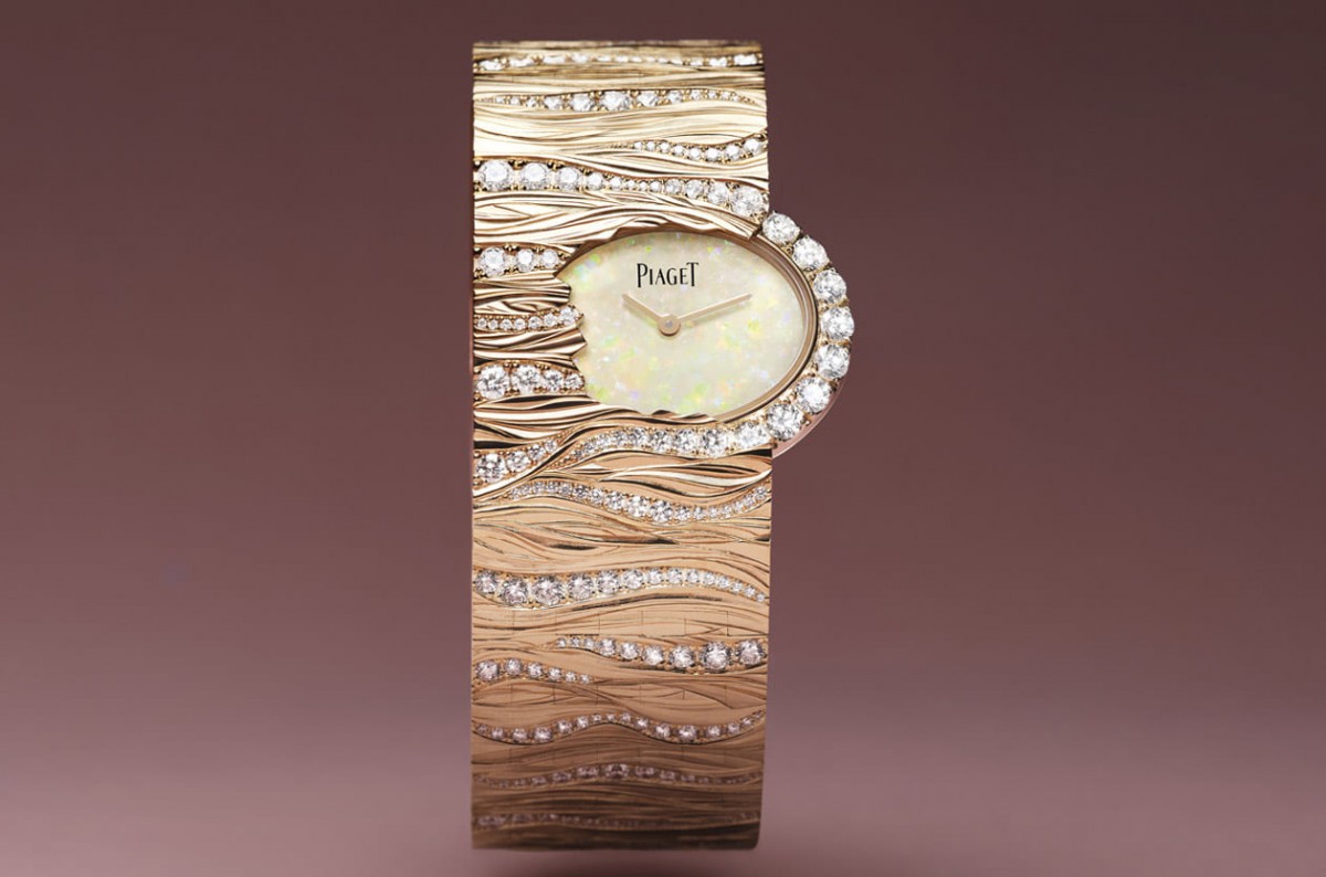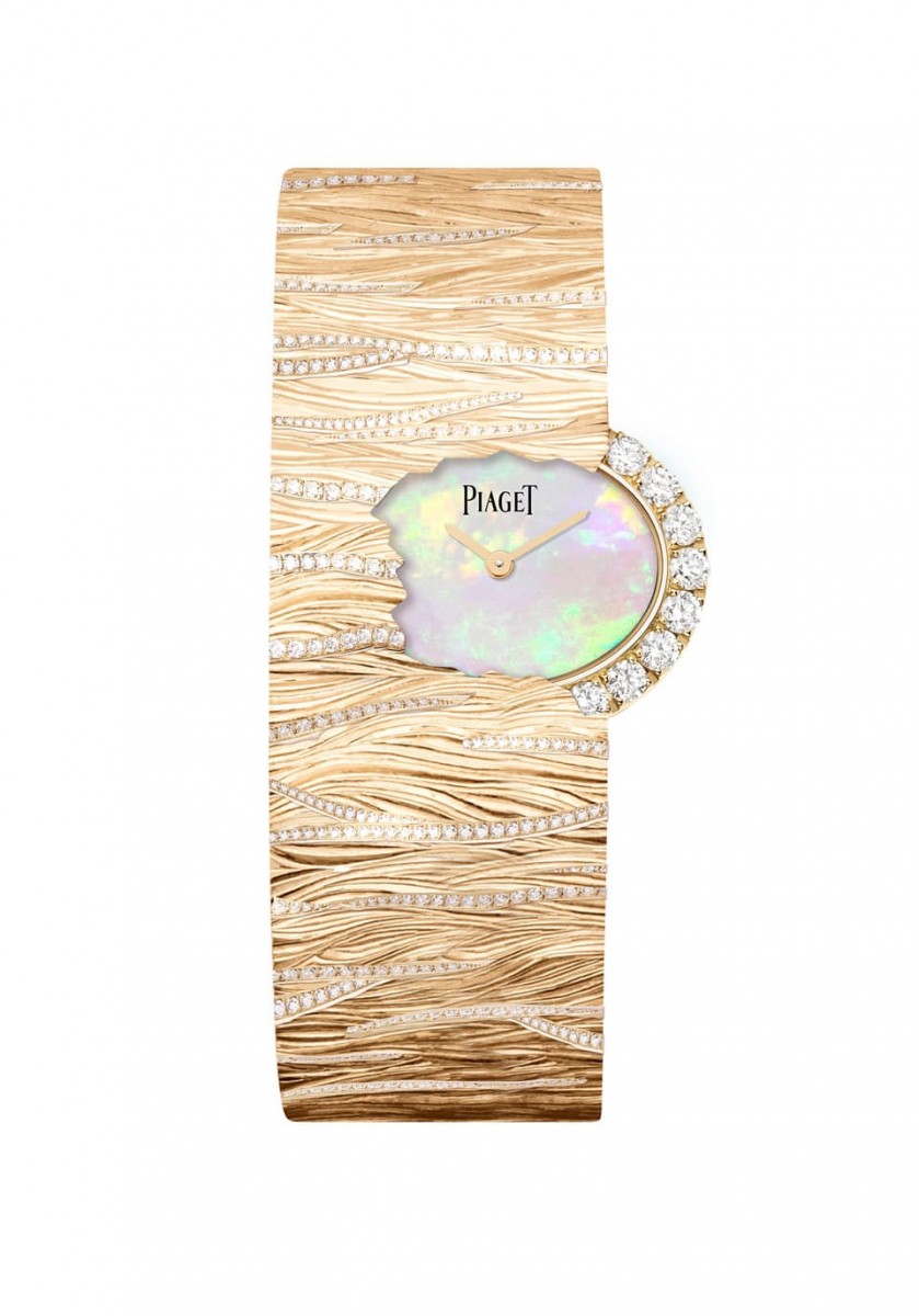 伯爵1960年代曾經以傳統機刻雕花(Guilloché)工藝打造出所謂的「宮廷式裝飾」風格,如今這種華麗的製作工藝再次延伸至品牌現代新創的手鐲錶作品上。系列作品無論採用玫瑰金或白金材質,工匠均會以尖針或機具在金質手鐲上雕琢出立體紋路,有的是不規則的水平條紋、也有的呈現煙火般的放射狀紋路;有意思的是,這些手鐲錶的面盤都像是從手鐲本體「破繭而出」般帶著不對稱的有機線條,橫橢圓形的面盤於突起於手鐲的右側分別鑲上鑽石、藍寶石或祖母綠,搭配不同款式面盤材質的變化(如蛋白石或土耳其石)等等,讓金質手鐲衍生錦上添花的視覺美感,每款作品似乎都有師法大自然的靈感,使其散發一股吸引人靠近的清新魅力。