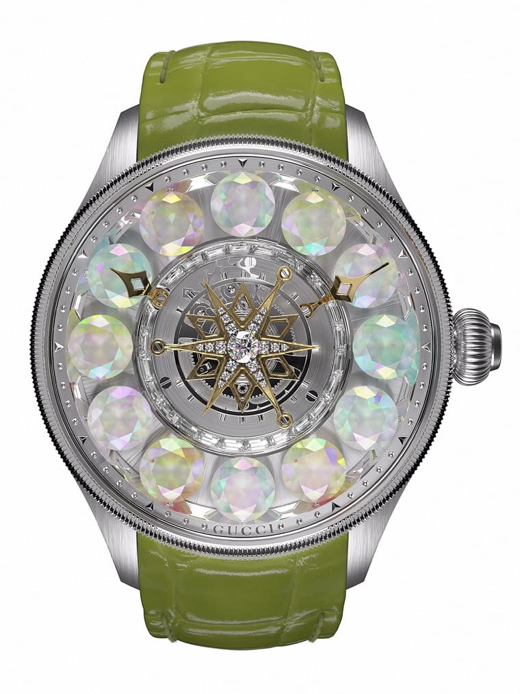 GUCCI以獵戶座大星雲NGC 1976命名手錶搭載的陀飛輪機芯GGC.1976.DS,顧名思義這款採用中置陀飛輪設計的作品不僅在星形陀飛輪框架鑲上璀璨美鑽,更在面盤上鑲上12顆寶石代表時標,甚至當佩戴者按下與錶冠同軸的按把時,這些寶石時標還可以進行自轉(寶石將自轉9秒,並在90秒內繞著面盤順時針旋轉),讓人看得眼花撩亂。GUCCI此次共推出四款G-Timeless Planetarium系列新作,其中有兩款以月球為主題,一款面盤鑲嵌12顆衣索比亞蛋白石,在半透明藍色背景的襯托下格外耀眼;另一款則由拓帕石、橄欖石、紫水晶和衣索比亞蛋白石組成如夢似幻色彩。系列中還有一款面盤鑲有紅寶石、火蛋白石、粉紅色碧璽及橙黃色石榴石等,詮釋無限美好的紅色日落景色;最後一款主題轉化為星辰,面盤上可見以金工製作的四種星星造型時標,每枚時標都會鑲上鑽石,與面盤中央的星形陀飛輪相互輝映,散發熠熠星光。