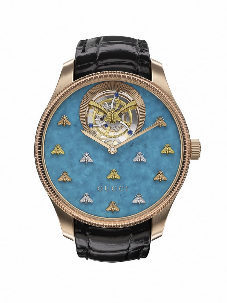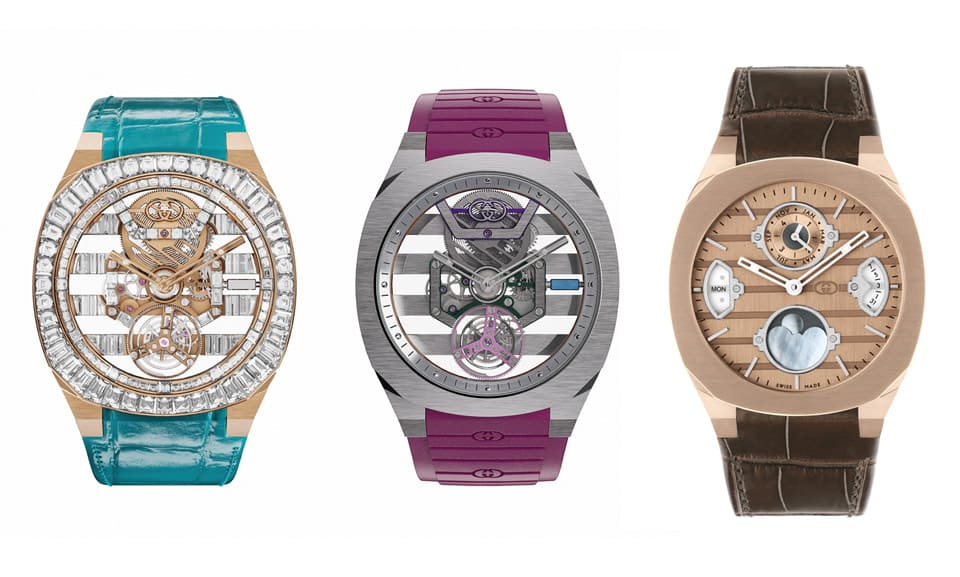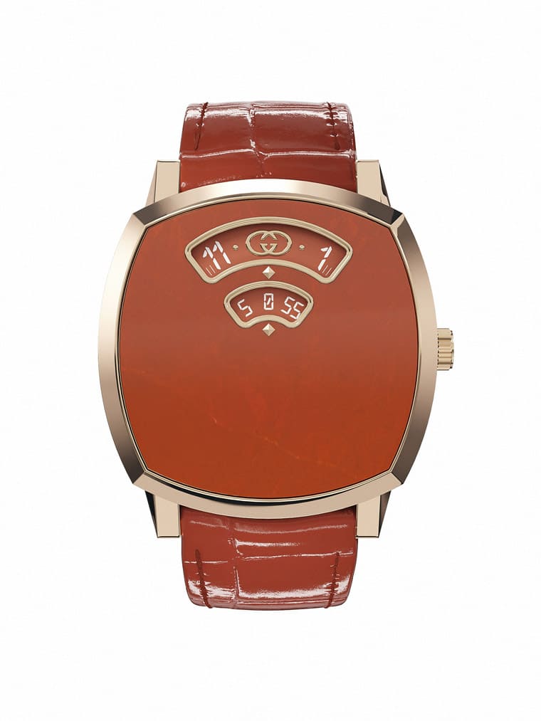 此系列主打錶壇於1920年代創制的跳時結構,這種結構的誕生主要是為了強調走時精準度:手錶顯示系統會在第60分鐘為「瞬跳」至下一個小時提供動力。2023年GUCCI分別推出兩款玫瑰金新作,一款搭配磚紅色碧玉面盤,一款則啟用綠玉髓面盤,兩款分別配置與面盤色調相近的鱷魚皮錶帶,搶眼外觀結合俐落跳時機制,讓人感受到品牌前衛大膽的造型創意與紮實的工藝水準。