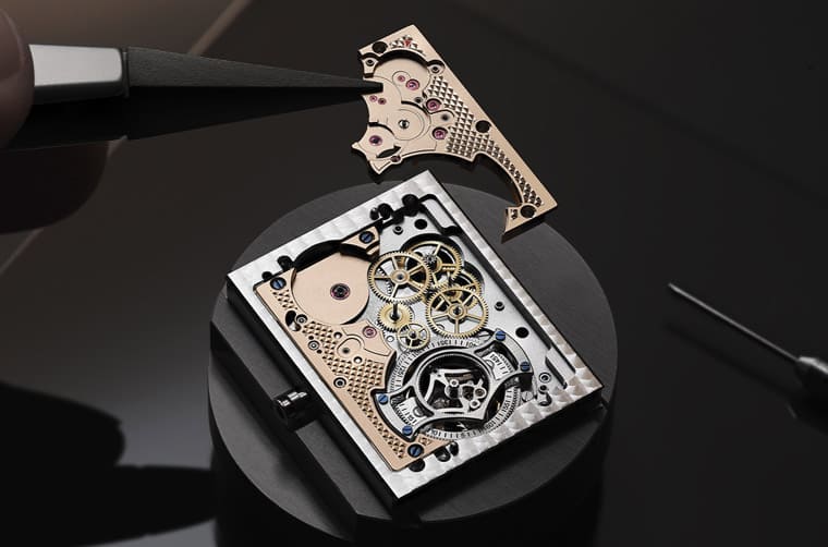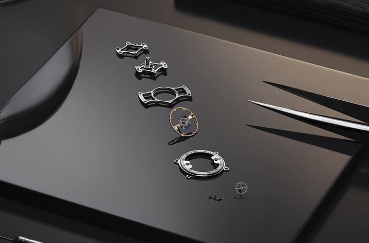 積家研發這枚機芯時重新設計過整個陀飛輪機制,品牌摒棄了通常用於固定平衡擺輪的陀飛輪橋板,以滾珠軸承系統代替陀飛輪外框架,將平衡擺輪固定於陀飛輪中央。一般來說游絲會固定在陀飛輪外框架,但由於這款作品捨棄了陀飛輪外框架,因此積家另外研發出獨家的S形擺輪游絲,此游絲一端安裝在陀飛輪裝置中央的固定點,另一端則固定在平衡擺輪上,之所以要做成S形,是因為可以有效避免游絲互相觸碰,令游絲與陀飛輪同心同軸,有助於提升手錶的走時精準度。