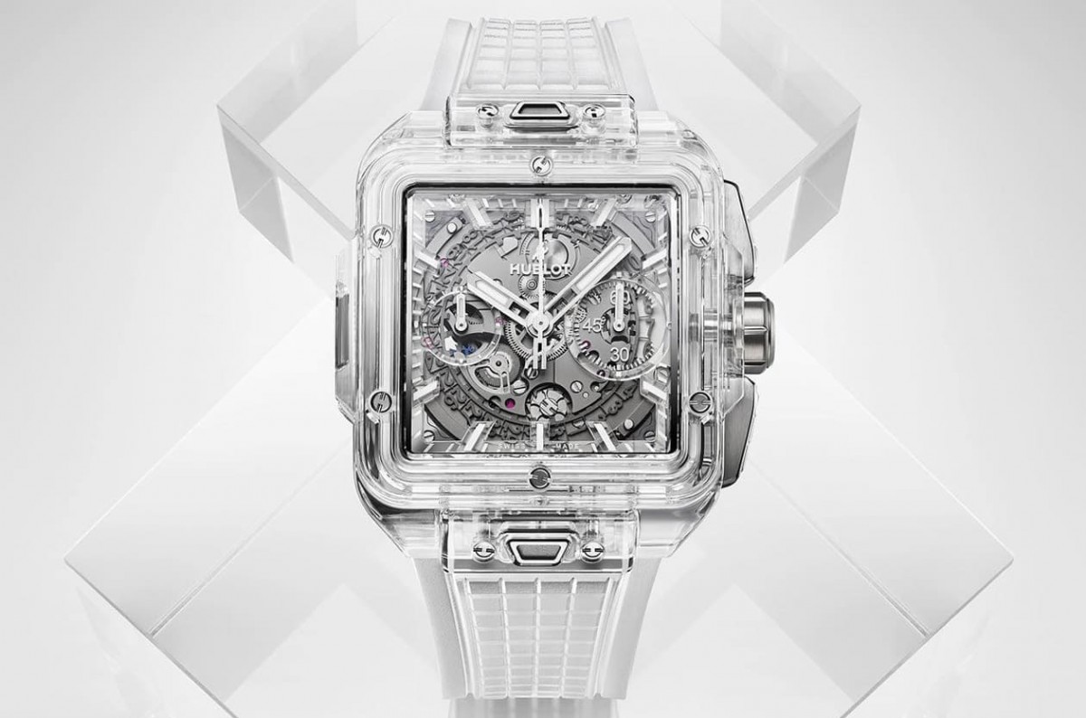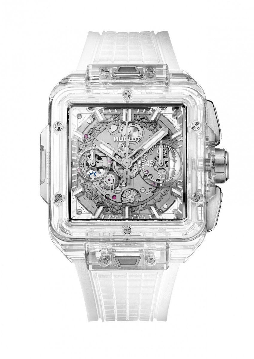 ▲宇舶亦將進年研發有成的藍寶石水晶材質導入Square Bang系列,開創出更全面性的賞錶視野。