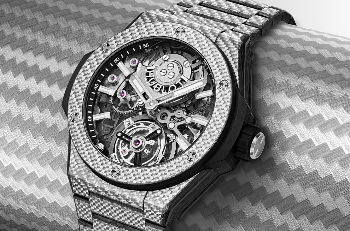 這幾年宇舶用心鑽研的陶瓷與藍寶石水晶等科技材質的努力一一開花結果,品牌並非錶壇率先應用這兩種材質製錶的第一人,可是他們在後天投入的努力程度確實很有後發先至超強氣勢,因此近期宇舶發表新作,出現陶瓷或藍寶石水晶錶殼的頻率相對高,這種慣例延續至2023年日內瓦鐘錶與奇蹟錶展登場的作品亦然。像是前文提及的Big Bang Integrated陀飛輪全碳纖維鍊帶錶便是一例,手錶外觀與傳統的碳纖維錶殼似曾相識,它們都具有獨特的編織紋路,而且重量也都很輕,不過宇舶的引進的鍍鋁碳纖維材質比起傳統的碳纖維材質又多了更多優點,舉凡強度、剛度,耐腐蝕性、耐熱性與抗衝擊性都更優異,這種材質在製作過程中會在碳纖維表面灑上一層鋁塗料,經過熱處理後使碳纖維表面形成堅實的鋁合金層,比起傳統碳纖維千篇一律的黑色調,宇舶採用的鍍鋁碳纖維材多了能夠融入色彩的設計彈性,因此Big Bang Integrated陀飛輪全碳纖維鍊帶錶才會呈現銀灰色調效果,從中突顯品牌掌握材質特性並克服製作過程難關的用心。