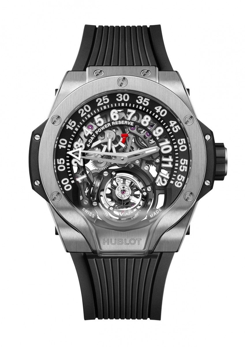 鈦金屬材質/HUB6200手動上鍊機芯/逆跳時、逆跳分顯示/雙軸陀飛輪裝置/動力儲存顯示/藍寶石水晶鏡面、透明底蓋/防水30米/錶徑44mm/限量50只/參考價:NT$ 4,905,000