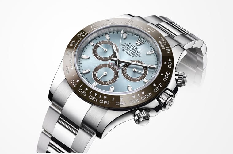 本篇就以Daytona系列的旗艦款——126506為例(前作為116506),看看鉑金冰藍面改成新型號後,手錶出現那些比較明顯的變化。Daytona系列的鉑金冰藍面分別有兩種版本,一為時標無鑲鑽款、一為時標鑲鑽款,勞力士在2013年首度推出鉑金、棕色Cerachrom陶瓷錶圈與冰藍色面盤的組合時,分別針對兩種時標版本做出細節區隔,除了可以透過鑲鑽時標辨別兩者之餘,面盤的三眼小錶盤也有箇中差異:時標無鑲鑽款的小錶盤刻度環採用與錶圈同色的設計,而時標鑲鑽款的小錶盤刻度環則是延續面盤整體的冰藍色調,使得手錶看起來更有”Ice Blue”那種嚴寒的視覺印象。