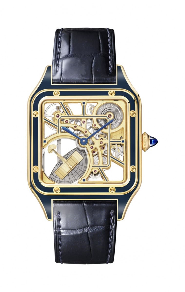新款Santos-Dumont鏤空錶一方面傳承系列自1904年首度問世時的經典造型,同時也多方使用不鏽鋼或貴金屬材質製作錶殼,至於系列在圓珠形錶冠鑲凸圓形藍色寶石的傳統也同樣維持不變。總計卡地亞一共推出不鏽鋼款、玫瑰金款以及黃金款等三種版本,它們依序搭配灰色、酒紅色和深藍色鱷魚皮錶帶,其中只有黃金款在錶圈與錶耳處點綴藍色真漆,呼應其限量150只的稀有性。
