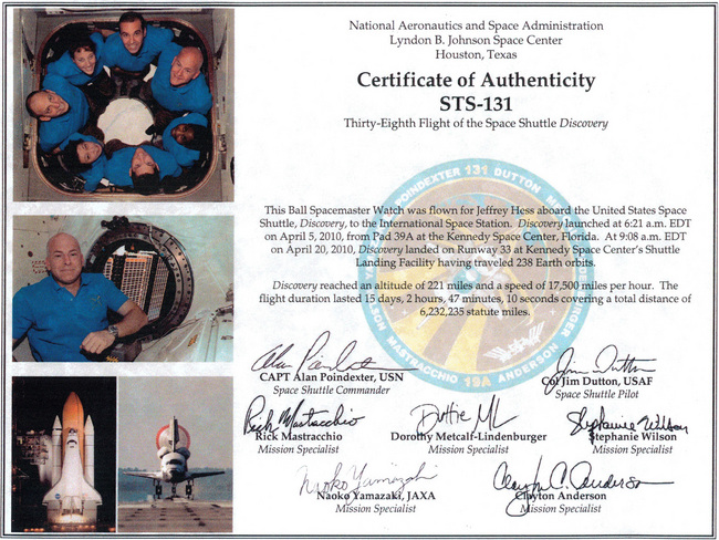 在整個旅程中,Poindexter隊長佩戴的是BALL WATCH Engineer Hydrocarbon Spacemaster型號手錶,在最惡劣的環境下為他提供精確的計時。當Poindexter隊長完成太空任務後,他記述自己所佩戴Engineer Hydrocarbon Spacemaster型號的性能,簡直令人驚嘆不已。這手錶往往在完全黑暗的環境中亦能精準報時,及能被清晰閲讀,完全達到他的期望。明顯地,應用於早期鐵路時計的簡單功能,同樣適用於太空飛行。為表揚BALL WATCH手錶對此任務所作出的貢獻, BALL WATCH公司獲美國太空總署頒贈認證證書,證明其Engineer Hydrocarbon Spacemaster型號曾登上美國太空穿梭機。