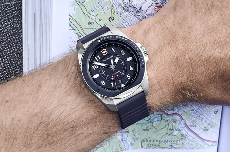 錶款的設計細節一如錶名,充滿濃濃的戶外探險風格,例如錶殼與錶圈造型擁有多重切面或是起伏強烈的曲線,就像山脈的有機線條般堅毅穩固。錶圈上設有前20分鐘的計時刻度、6點方向特別鐫刻”1884”字樣,代表VICTORINOX的創立年份,此處的立體切面像是被刻意切削過,與品牌著名的瑞士刀產品淵源呼應。面盤部分的設計也很有巧思,例如效仿瑞士登山路標的指針、呈現山徑表面粗糙紋理的面盤,秒針末端的平衡器造型也帶有瑞士刀的既視感,此外機械機芯款和石英款的面盤格局會有些同中求異的變化,讓人可以從中區辨手錶搭載不同類型的機芯。