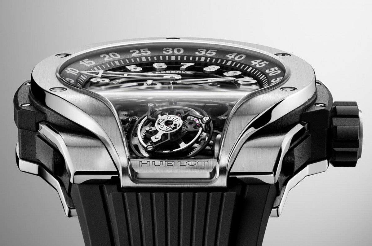 MP-13的雙軸陀飛輪內、外部框架分別以30秒與1分鐘的週期自轉,形成炫目的360度旋轉動態,陀飛輪軸心雖與機芯組件呈直角排列,但因為這次腕錶搭載的HUB6200手上鍊機芯是將陀飛輪裝置「包進」機芯的圓形輪廓中,相較於MP-09 HUB9009.H1.RA機芯的陀飛輪裝置獨立於機芯下半部的設計各有千秋,因此MP-13的雙軸陀飛輪會更往機芯中軸內縮,甚至讓品牌有餘裕在陀飛輪下方被鏡面覆蓋的錶殼內部刻上"HUBLOT"字樣,展現出品牌設計的靈活變通性。