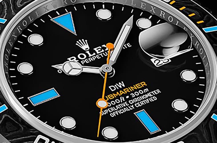 錶款的碳纖維錶圈於每五分鐘的刻度上都填上水藍色,至於前15分鐘的下潛刻度又塗成橘色,彷彿是在預告面盤的設計方向一般,賦予原本僅是黑色錶圈與面盤的勞力士水鬼更豐富的色彩美感。錶款的黑色面盤分別在6點、9點與12點方向的時標塗上水藍色夜光物料,秒針則改成橘色調,同時6點方向的白色字樣中,唯獨”SUBMARINER”的系列名稱改用橘色突顯,形成面盤同樣以黑色為背景,並以水藍色與橘色點綴的搶眼風格。