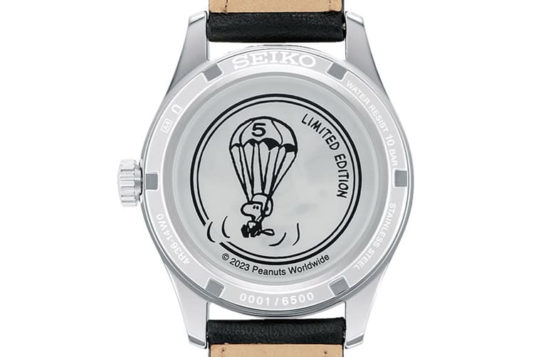 SRPK25K1背面刻印上史努比站在浪板上愜意衝浪的圖案,圖案右上角印有”LIMITED EDITION”字樣,並也同樣由此傳達手錶達到100米防水性能的相關資訊。