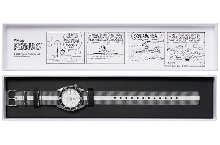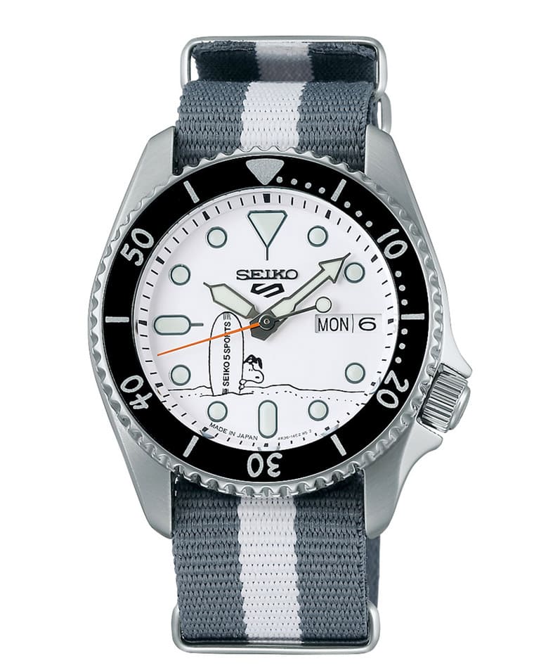 品牌從1963年報紙連載的《Peanuts》漫畫中獲得靈感,在SRPK25K1的面盤放上史努比化身成衝浪者的圖案,他手拿印有”Seiko 5 Sports”字樣的衝浪板並從後方探出頭來的模樣相當討喜,原本素雅的白底黑字面盤,在史努比圖案點綴下瞬間變得充滿逸趣。甚至連旋轉錶圈上的阿拉伯數字刻度也同樣改用《Peanuts》原創作家查爾斯.舒茲(Charles M. Schulz)的手寫字體,使得手錶跳脫系列本有框架,在整體風格方面突顯與《Peanuts》聯名的強大關聯性。