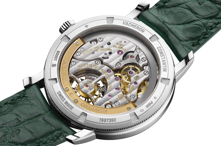 目前Traditionnelle系列搭載自動陀飛輪機芯的作品都是採用玫瑰金材質,包含前面提到的一般本,以及面盤鑲有龍鳳金雕的限量版,所以新款Traditionnelle陀飛輪雙雙在錶殼材質以及配色上做文章,呈現令人印象深刻的新氣象。江詩丹頓以鉑金材質打造手錶41mm大小適中的錶殼,Traditionnelle系列的雋永圓形錶殼在鉑金的烘托下顯得熠熠生輝,而且品牌還替手錶搭配深綠色密西西比鱷魚皮錶帶,這種顏色的皮帶過去在江詩丹頓旗下的作品中相對難得一見,而之所以會採用如此吸睛的皮革顏色,自然是出自要與面盤顏色呼相輝映的用意。