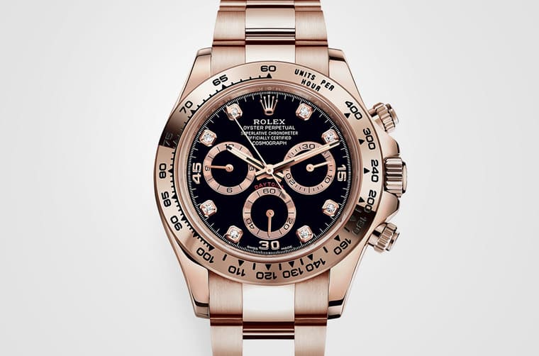 ▲Daytona 116505整只錶的錶殼、錶圈與鍊帶都是永恒玫瑰金材質,黑色面盤上鑲有8顆明亮式切割鑽石,目前市場行情普遍高於定價。