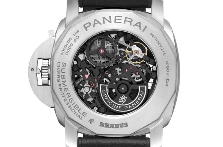一如先前沛納海 x BRABUS發表過的聯名手錶,PAM01403同樣搭載P.4001/S這枚機芯,所以可見面盤呈現鏤空造型,9點方向設有結合日夜顯示的小秒盤、3點鐘方向則有品牌專利的偏光水晶玻璃日期顯示,這表示手錶只有在日期窗內部才會露出當天的日期數字,而看不到日期顯示盤的剩餘數字,如此一來能夠讓佩戴者更有空間充分欣賞手錶的複雜結構。這次手錶的指針與部分細節乃是點綴紅色,這和BRABUS代表性的顏色有關,而非以特定的遊艇作為發想對象。