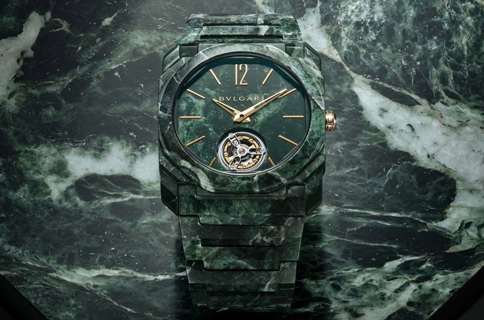 品牌表示研發Octo Finissimo Tourbillon Marble前後花了將近五年才大功告成,目的是要在鈦金屬的表面鑲上綠色大理石薄片。看到大理石這個元素,有的人應該會想起位於羅馬康多提大道的寶格麗旗艦店,因為它的門口也是用這種石材裝飾,所以品牌會想到用此種元素除了可以呼應他們的工藝淵源,也蘊含了一些品牌印象在其中。
