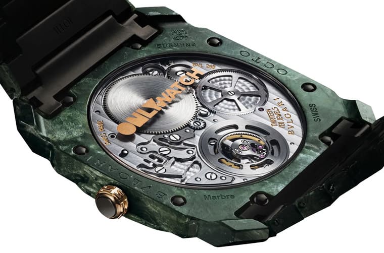 錶背透明底蓋邊緣仍舊鑲有大理石薄片,透明底蓋的上半部則印有金色的Only Watch字樣,底蓋下亮出BVL268機芯,它的厚度僅1.95mm,是曾寫下超薄紀錄的明星作品,機芯的規格包括3Hz震頻、52小時動力儲存,穩定、實用且具有工藝代表性的設計是品牌相中它做為大理石手錶基礎的一大關鍵。Octo Finissimo Tourbillon Marble的錶盒同樣延續手錶外觀的驚豔感,寶格麗在錶盒頂部鑲上一片綠色大理石,在還沒正式開啟錶盒前,就可以先一步感受到內部放置的手錶與眾不同的迷人之處。