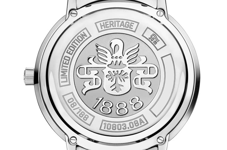 所有的傳承系列瑞士官方天文台認證手錶皆採用實底蓋設計,底蓋鐫刻著一枚天鵝造型的1960年代寶齊萊家族壓花徽章,此一圖案有三個含義,包括代表品牌故鄉所在地琉森、代表寶齊萊家族的山毛櫸樹,以及品牌創立的年份(1888年)。