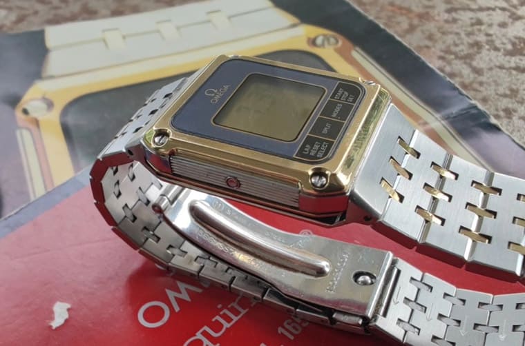 最近在IG上就有人分享了歐米茄Equinoxe這款古董錶,手錶外觀看起來是雙色設計,金色部分不確定是K金還是鍍金,但是在錶圈,以及鍊帶錬節之間的連接零件等處皆一律改成了金色調,與不鏽鋼錶殼和鍊帶形塑出雙色視感,IG上的影片一開始就停在已經翻轉過後的手錶第二面,在這一側的面盤可以看到數位顯示呈現出時、分、秒等資訊,面盤下方則透露出手錶透過錶側的按把可以操作鬧鈴、計時與倒數計時等功能。