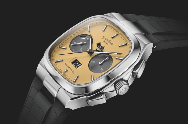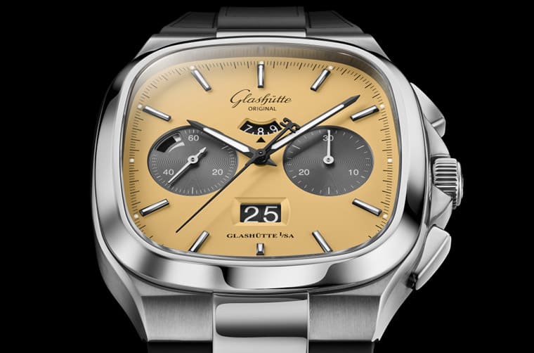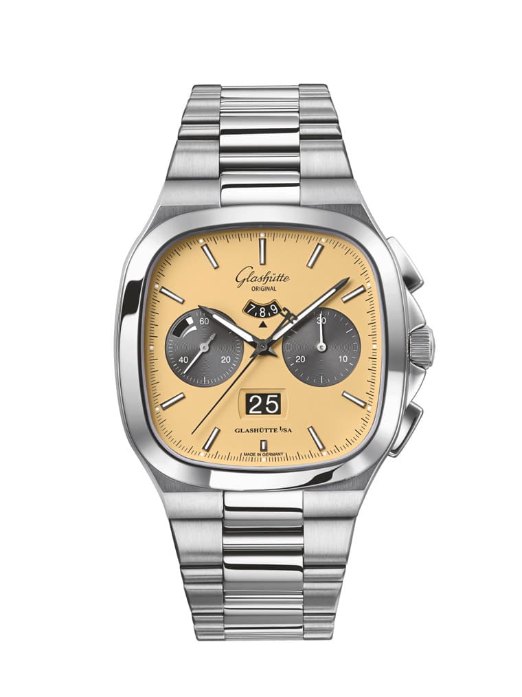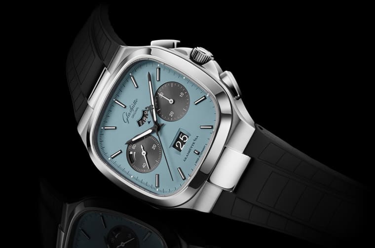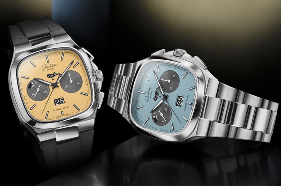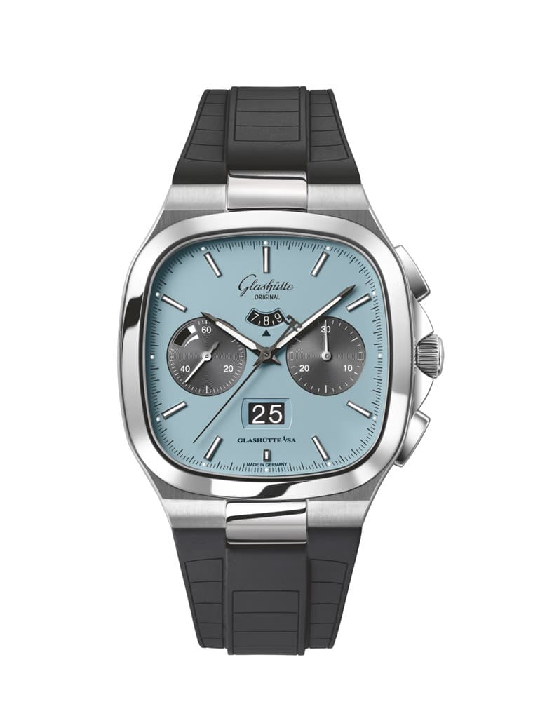 Seventies Chronograph Panorama Date新作從1970年代的文化流行擷取靈感,當時盛行印花圖案、蠟染漸變色等元素,穿衣風格則是偏向休閒寬鬆版型,社會充滿大膽冒險的自由精神。錶款這次的造型設定一如既往,40x40mm的錶殼分別經過拋光與緞面處理形成較為多變的層次,格拉蘇蒂原創還分別替兩種面盤顏色款式配置黑色霧面橡膠錶帶或不鏽鋼鍊帶供市場選擇。