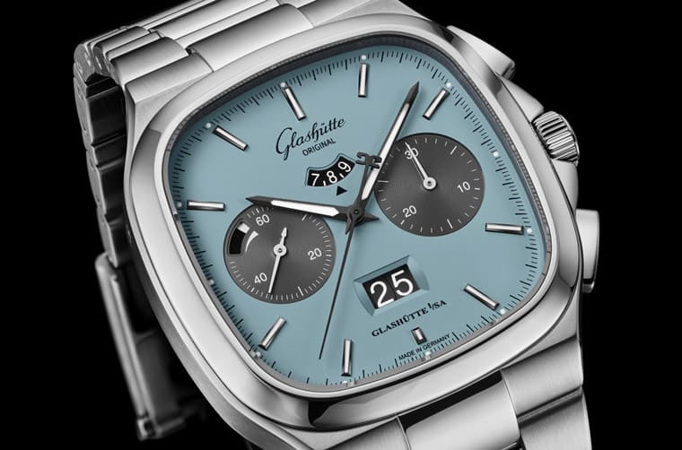 GLASHÜTTE ORIGINAL格拉蘇蒂原創復古系列的Seventies七零年代手錶繼Sixties系列後也推出新作,品牌分別推出兩款不鏽鋼材質作品,一款採用「海灣金」色面盤,另一款則是「海風藍」面盤,其中後者搭上近年很夯的TIFFANY藍面熱潮,成為罕見帶有此種色調的方形手錶。