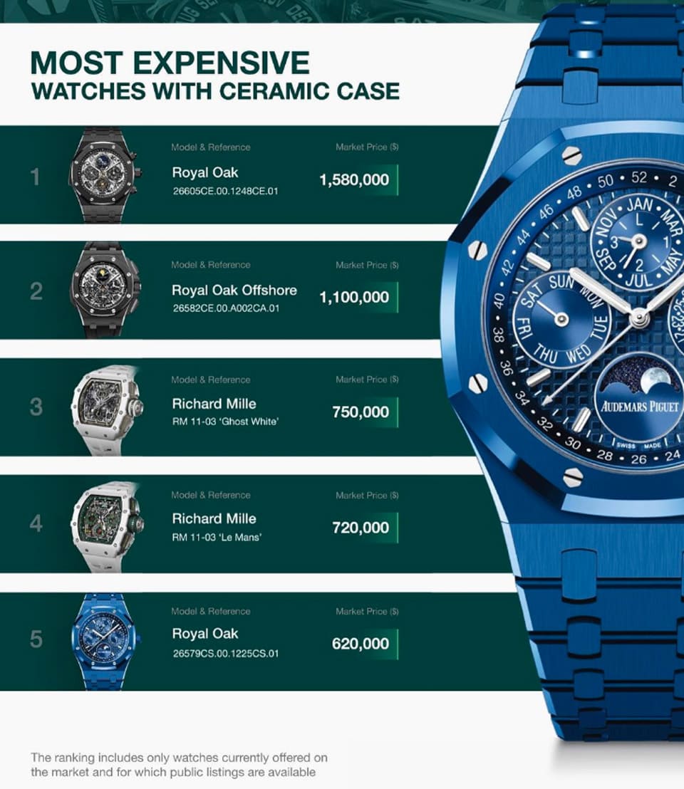從Watchanalytics列出的5款行情最好陶瓷錶可見它們都是來自AP和RM這兩大品牌,而且手錶原本就屬於價位較高的複雜功能手錶,由於陶瓷材質竄紅導致手錶的二級市場價格飆高,前5名幾乎都在台幣2,000萬起跳,這種價格與我們一般看到的陶瓷手錶價格完全是不同檔次,堪稱是陶瓷手錶中的聖杯級大物。