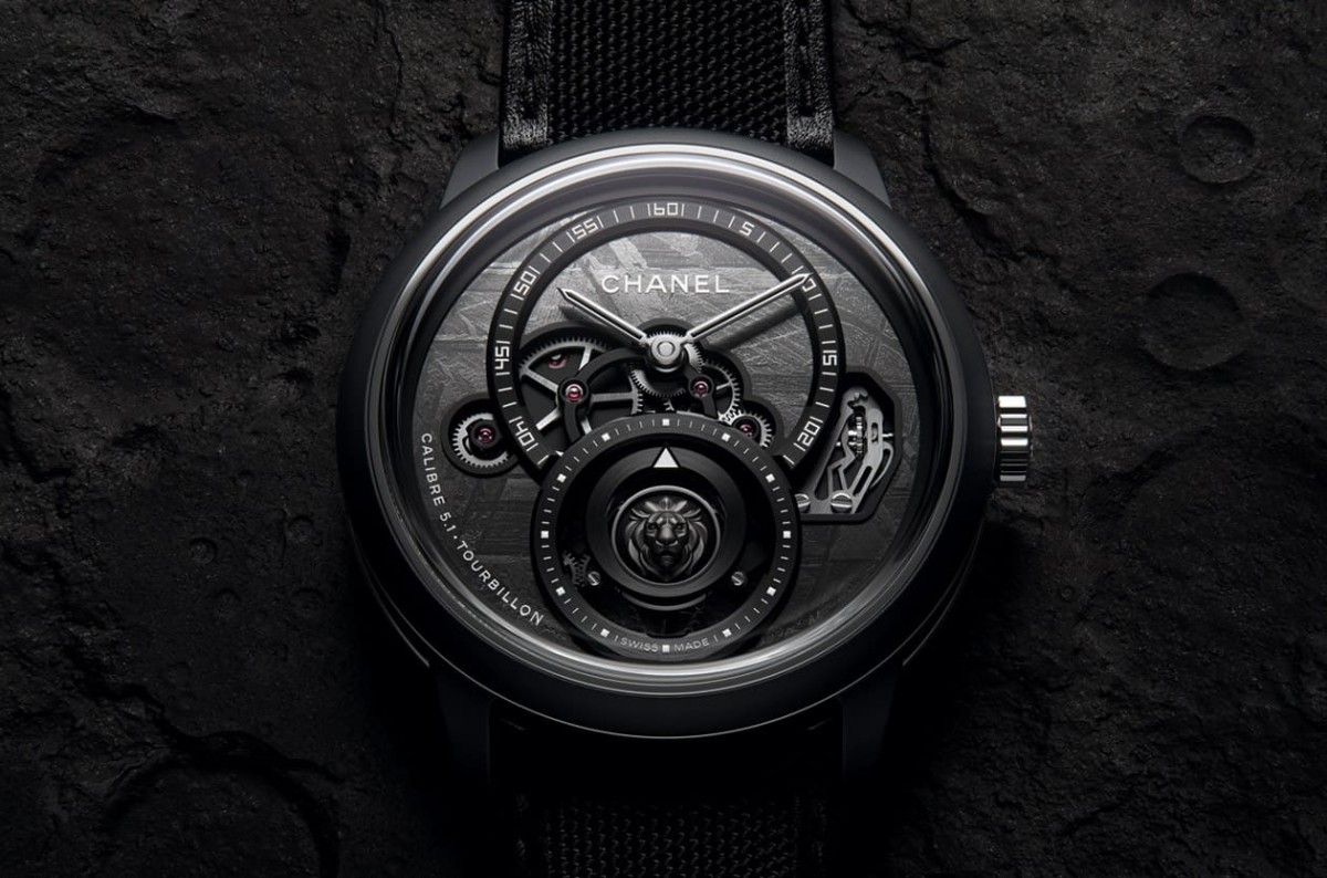 搭載Caliber 5的J12鑽石陀飛輪腕錶其錶面視覺是放在鑽石與陀飛輪呼應的閃耀,但Monsieur陀飛輪隕石腕錶則由於香奈兒2023年以【Interstellar】星際為題的限定腕錶系列,因此在腕錶面盤上可見和設計主題有關的隕石材質。品牌使用來自瑞典的隕石擷取製錶所需的元素,並經過徹底清潔、拋光,加上酸洗工序等,務求去除礦物表面的粗糙感,使之變得光滑平整,適合用於製作腕錶面盤。由於Monsieur陀飛輪隕石腕錶如前所述呈現一個類似數字”8”的造型,因此用以製作面盤的隕石還需要經過鏤空處理,如此才能避開時、分小錶盤的刻度環、陀飛輪框架,以及3點和9點方向的機芯組件,原本是機芯機板的地方鑲上了隕石後更能突顯腕錶代表的Comet彗星主題,隕石面盤由於稀有且帶有獨一無二的特性(因為每款錶隕石面盤的紋路不可能完全ㄧ樣),往往與高級腕錶結合都能製作話題、吸引層峰市場青睞,Monsieur陀飛輪隕石腕錶奠基於香奈兒自製機芯的深厚工藝基礎,再結合「彗星碎片」此一迷人元素,讓人戴著錶也彷彿帶著一部分的星體同行,箇中樂趣妙不可言。