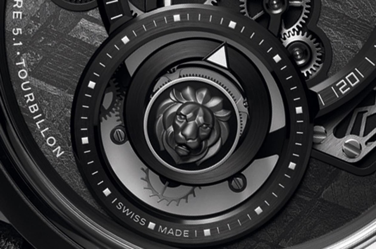 ▲Caliber 5.1將陀飛輪軸心換成以雷射雕刻而成的立體鈦金屬獅首造型,比起前一版的鑽石軸心展現了截然不同的內斂威嚴氣勢。