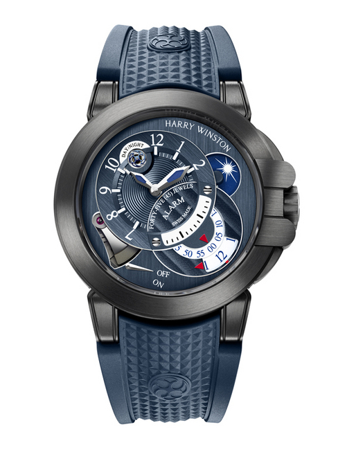 Project Z6湛藍色面盤款式手錶具有Project Z6系列精巧的鬧鈴功能,鬧鈴由一個問錶式的鐘錘組成,由其敲擊音簧發出清脆的聲音。此設計不僅能“耳聞”,亦能“眼見”,鐘錘固定於鋯合金錶殼內,發出鬧鈴聲時的敲擊動作清晰可見,不但提升聲音的傳送效果,而且增加幅度和音量。它構成海瑞溫斯頓多層次錶盤的一部分,一個顯示主要時間,另一個顯示鬧鈴設定時間,每個均配有獨立的晝夜指示。雙發條盒提供72小時動力儲存,確保複雜功能不會干擾機芯的計時功能,進一步凸顯其實用性。