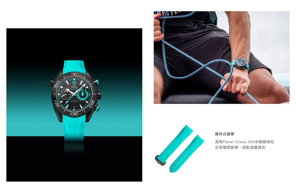 ▲歐米茄提供綠松石色的橡膠錶帶供錶主選配,營造另一種活躍動感。