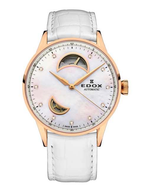 全新的Open Heart女錶,將夜晚星空的元素運用在此系列,其時間盤上就裝飾了11顆夜晚的星芒,鏤空玄月窗造型分別在12點鐘與7點鐘方向的機芯擺輪之上,彷彿在瞭望星空的祕密一般,欣賞著機芯擺輪震動時的美景。錶面採用光澤的珠母貝,增添層次美感與其讓手錶充滿豐富的表情與變化。另外,手錶錶背也做了鏤空的設計一覽無遺猶如銀河系中的機芯擺動。ETA 2824 機芯,白色壓紋真皮錶帶、有不鏽鋼與或玫瑰金PVD包覆兩種選擇。