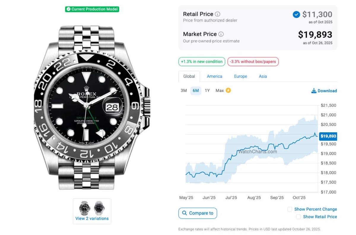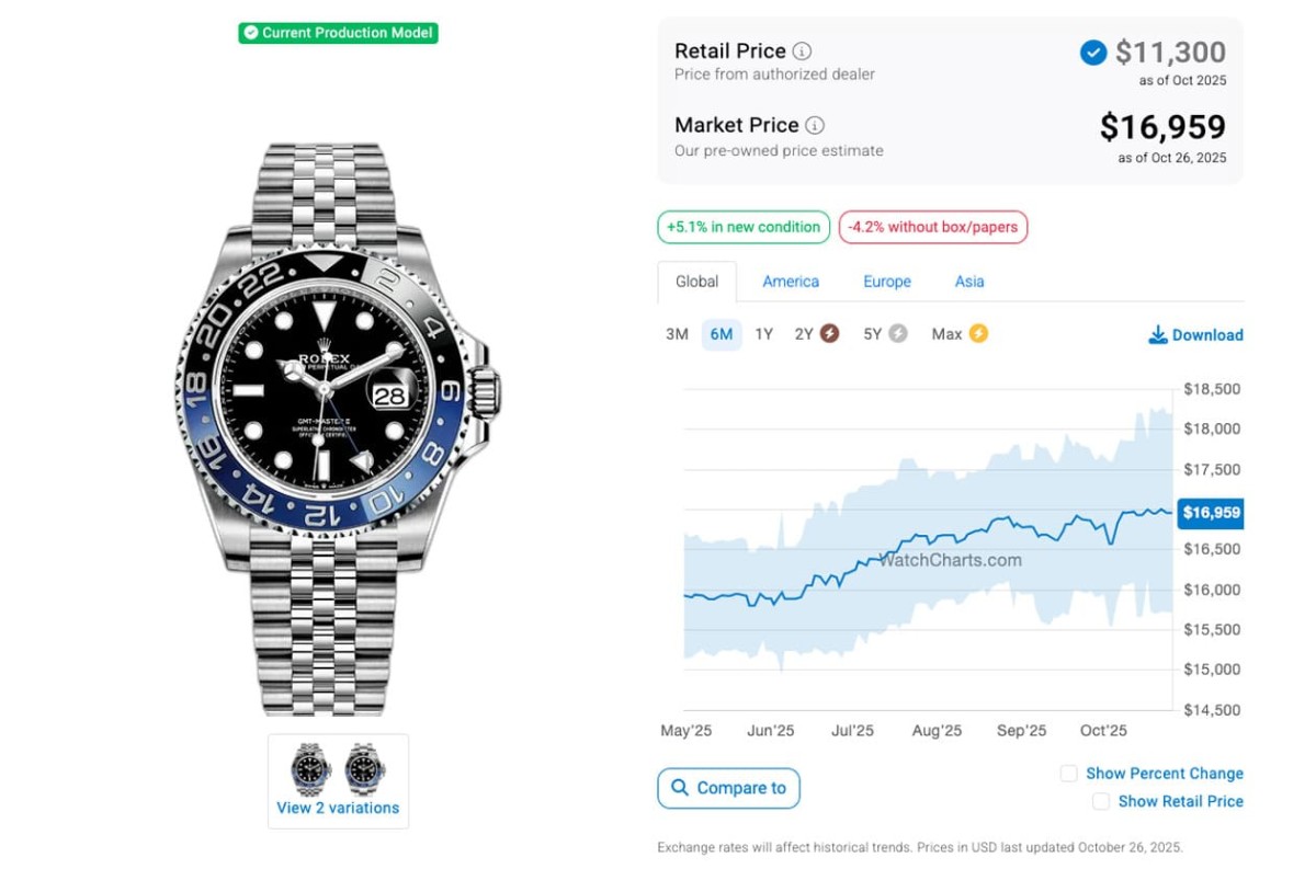 根據高級手錶市場調查研究機構WatchCharts的資料在2025年4月時的追蹤,當時126710BLNR-0002、126710BLRO-0001、126720VTNR-0002和126710GRNR-0003(皆為五珠帶)的國外報價分別是15,930美金(約合台幣48萬7)、19,522美金(約合台幣59萬7)、16,724美金(約合台幣51萬2)和17,909美金(約合台幣54萬8),已經處於二級市場熱門錶價格連續下滑的階段好一陣子了;至於又過了半年左右的現在,這四款鋼殼GMT-Master II爆款的身價又呈現怎麼樣的變化呢?