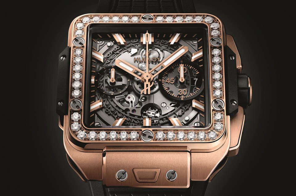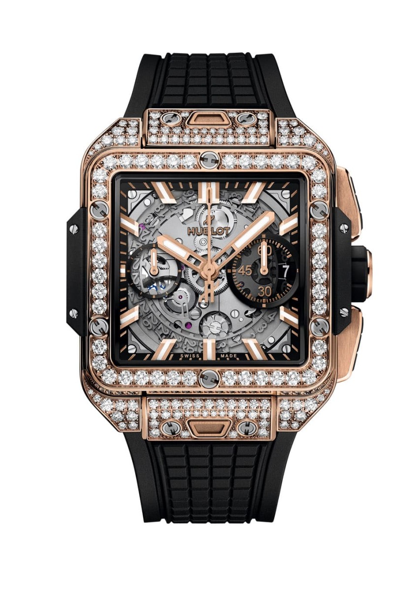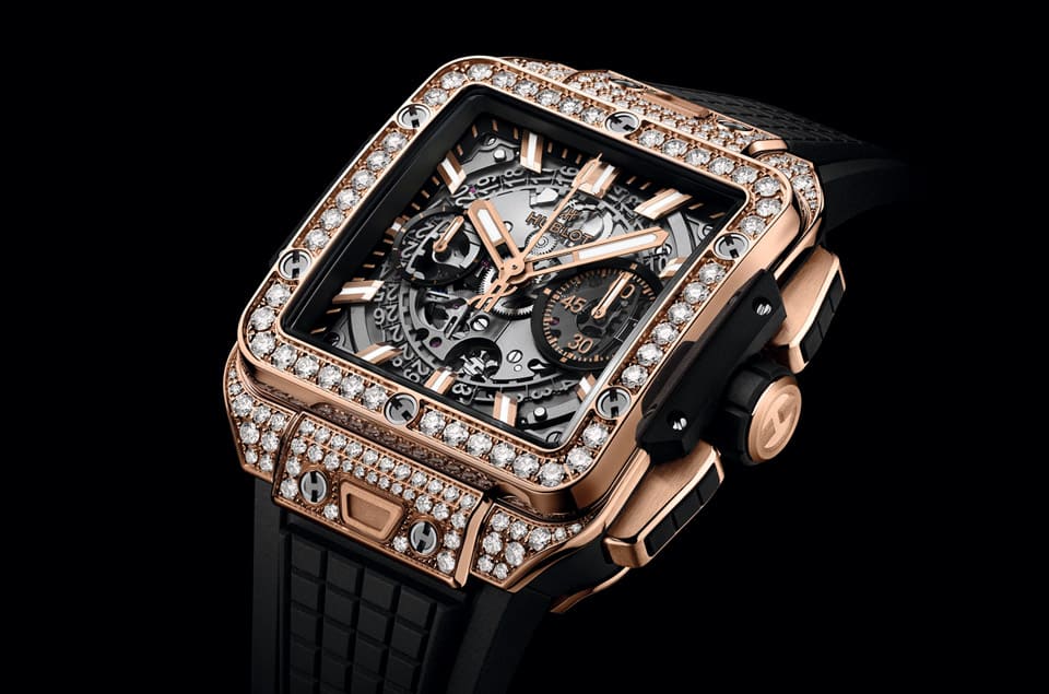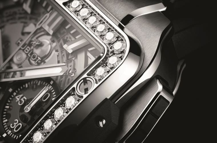 ▲Square Bang系列以特殊的方形錶殼著稱,模組化多層次錶殼加上鑽石裝飾後更能突顯手錶的輪廓造型。