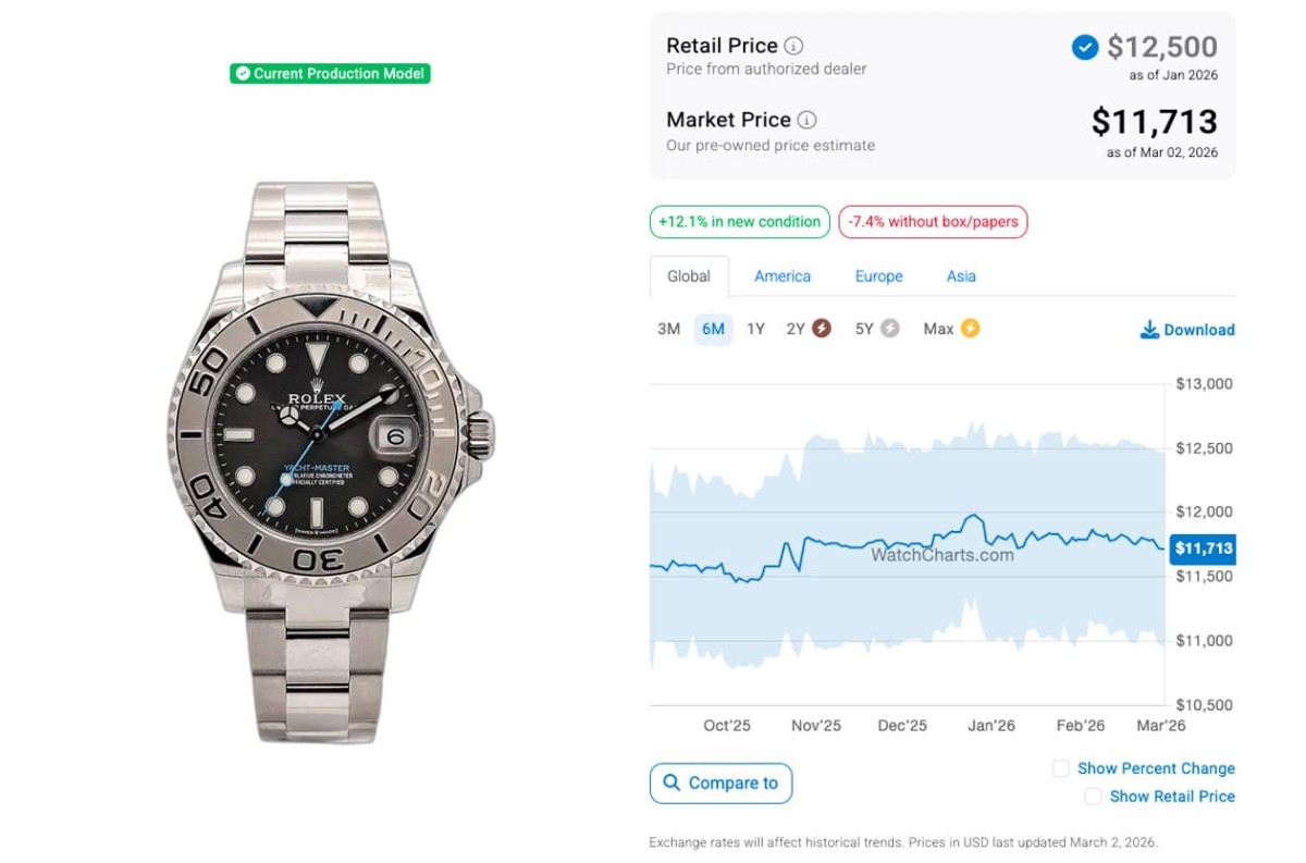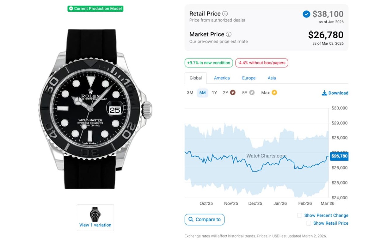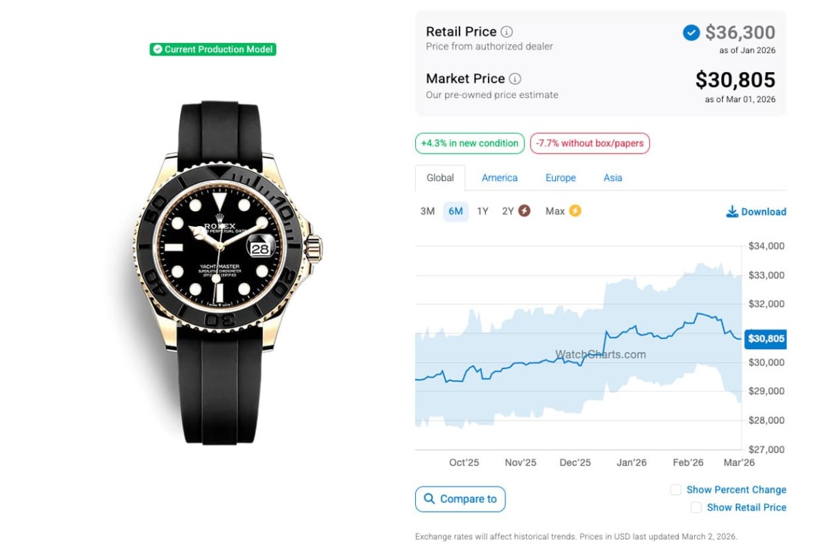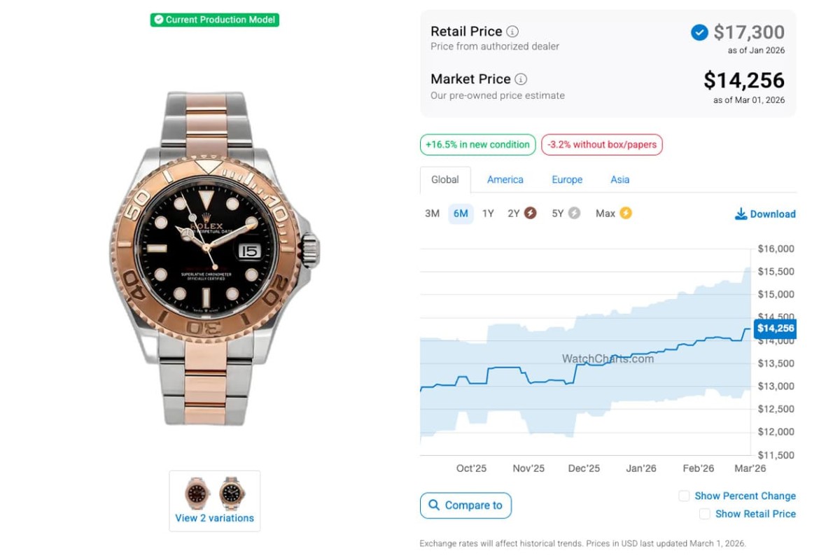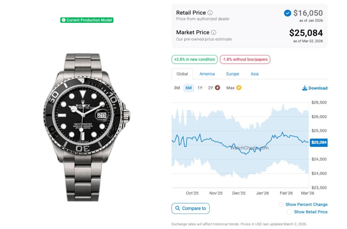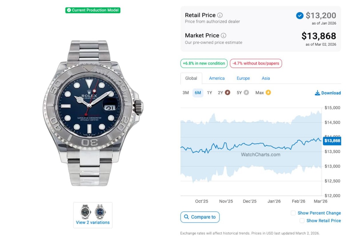 目前遊艇系列的入門款定價已經超過台幣40萬,貴金屬款式價位超過百萬的也逐漸增多,不過遊艇相較勞力士其他熱門系列的表現並沒有這麼強勢,尤其經過2022年第2季以後高級手錶市場價格全面下滑至今的影響,現在遊艇系列各款錶的二級市場價格大致也都在往下走。