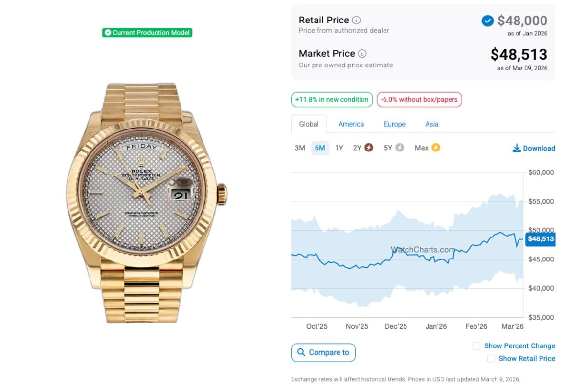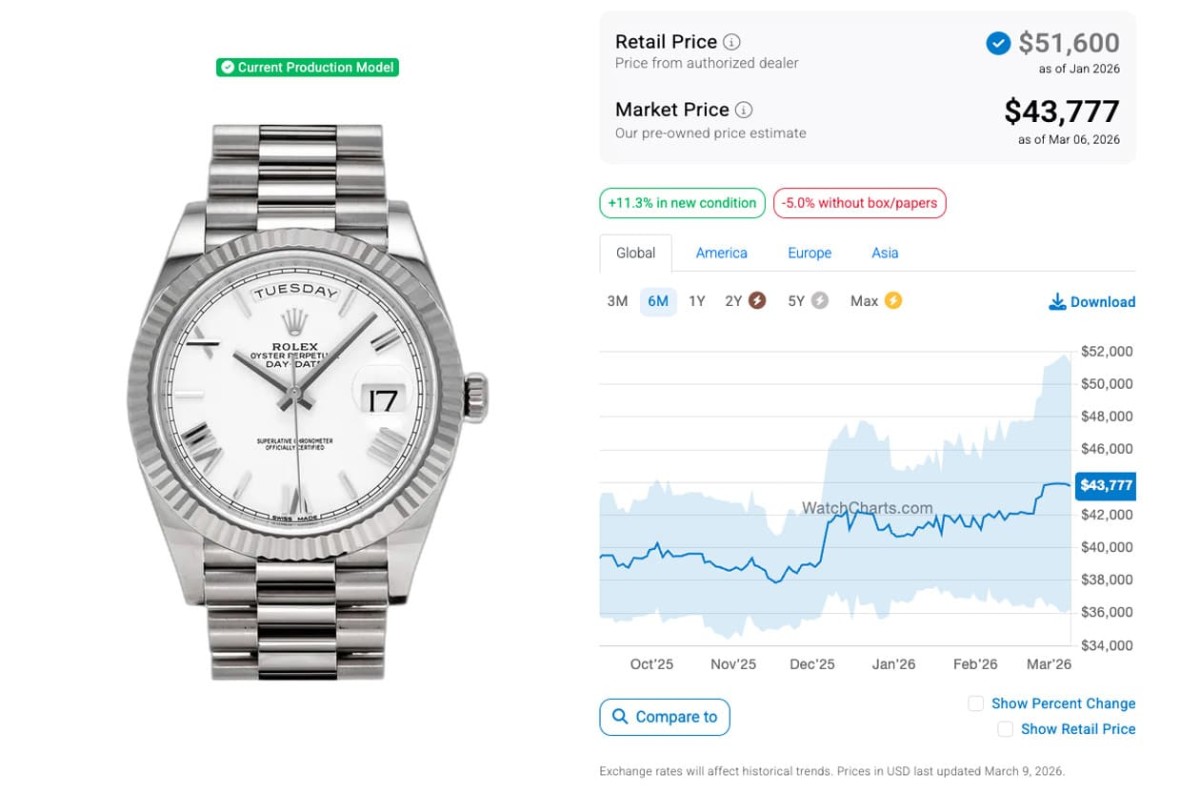 轉眼到了2026年3月,過去半年以來,Day-Date 40mm的二級市場價格有起有落,不同材質之間有各自的發展,其中鉑金款的發展有點戲劇化,原本在2025年2月突然氣勢如虹成長至短期內的高峰,然後在那之後又有點疲軟下滑,尤其是4月時跌到該年谷底,後來略有起伏之後一度降至比4月時更低的價位,不過10月以來又有起色開始往上爬,到目前經過五個多月來價格還滿平穩的。而一向行情較差強人意的白金款,也在2025年2月後突然衝上來,行情維持到5月,至7月為止又有比較明顯的下滑,可是進入到8月後又再升起,至9月中旬到該年底原本變化也不算大,2025年12月到2026年迄今又衝高了兩波起來。同樣根據WatchCharts的資料,黃金、永恒玫瑰金、白金與鉑金Day-Date 40mm如今的行情依序是48,513美金(約合台幣154萬3)、49,780美金(約合台幣158萬4)、43,777美金(約合台幣139萬3)和76,621美金(約合台幣243萬8)。現在除了鉑金款還有比較明顯的超定價,其他三款就剩黃金款勉強還在定價線之上了。