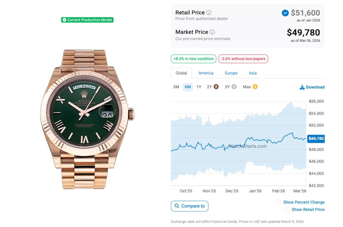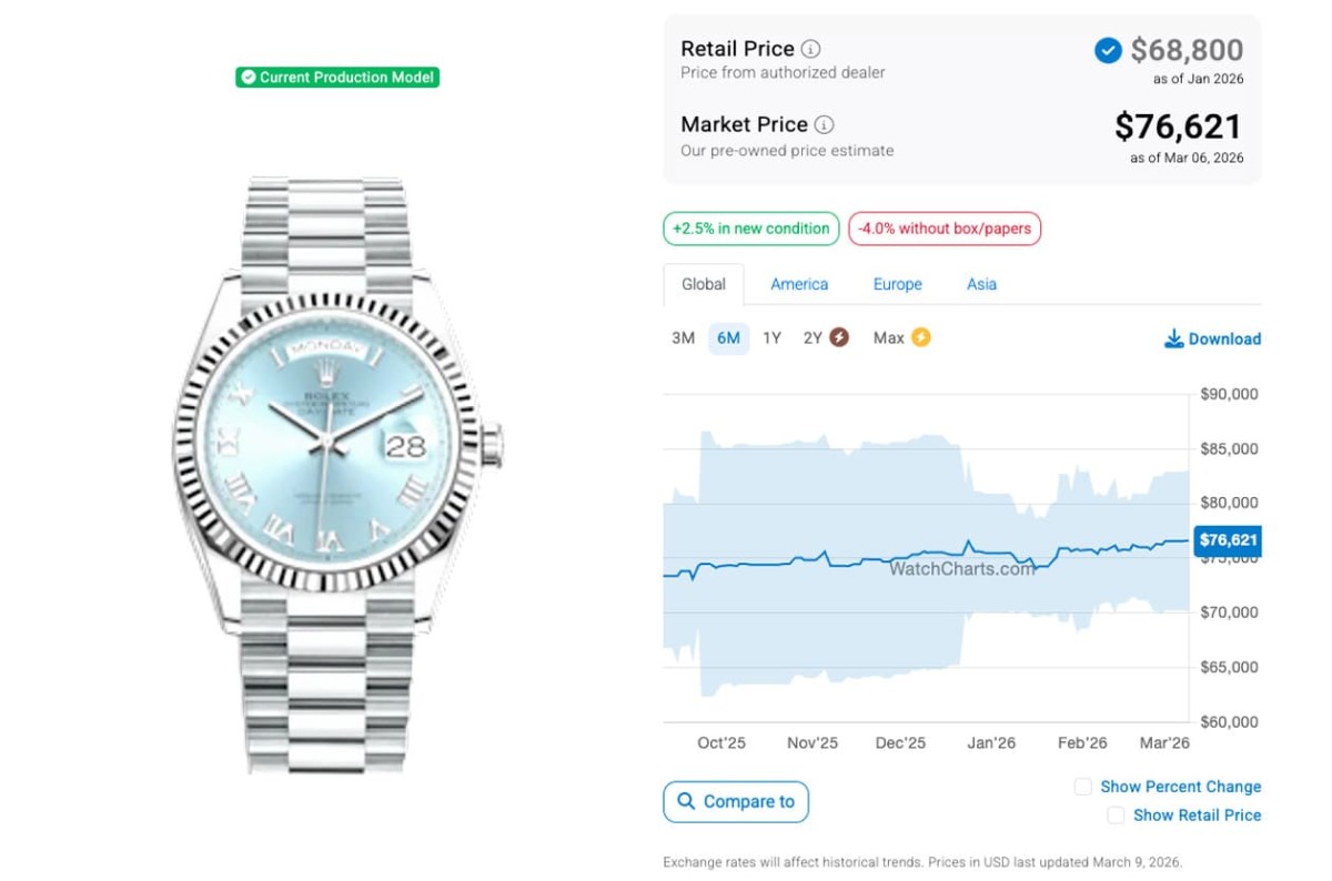 以最新的行情走勢來看,鉑金款溢價率還是有11.3%這等相對高的水準,黃金款在2026年初定價調漲後,國外報價一度失去溢價行情,2~3月因為有漲起來所以溢價率重新冒出1%的微幅空間。至於永恒玫瑰金款和白金款雖然近兩個月身價有回溫,但目前落在定價線下面仍有一段距離;相較之下鉑金款的溢價行情顯得穩如泰山——即使它的整體行情回不去前幾年的巔峰。總之若你對Day-Date系列很有好感,而且對於錶殼材質沒有特別偏好,現在要入手白金款式的門檻還是相對最低的選擇,但如果入手後會考慮再轉手的話,手錶的保值性也還是必需考量進去,這時白金款就不一定是最理想的目標了。
