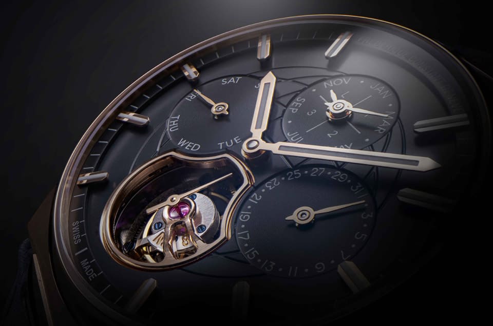 Highlife自製機芯陀飛輪萬年曆限量錶的萬年曆功能透過12點、3點和9點位置的小錶盤依序陳列星期(兼閏年)、日期和月份等資訊,至於陀飛輪則是設在與星期顯示相對的6點位置,陀飛輪框架的軸心加上一枚小指針能讓佩戴者判讀概要的秒數,而且康斯登為了不破壞萬年曆小錶盤的分佈,特別將陀飛輪顯示的上半部窗口設計成兩個凹口,其邊緣還有金屬零件加以區隔,同時也能作為陀飛輪的上層橋板。