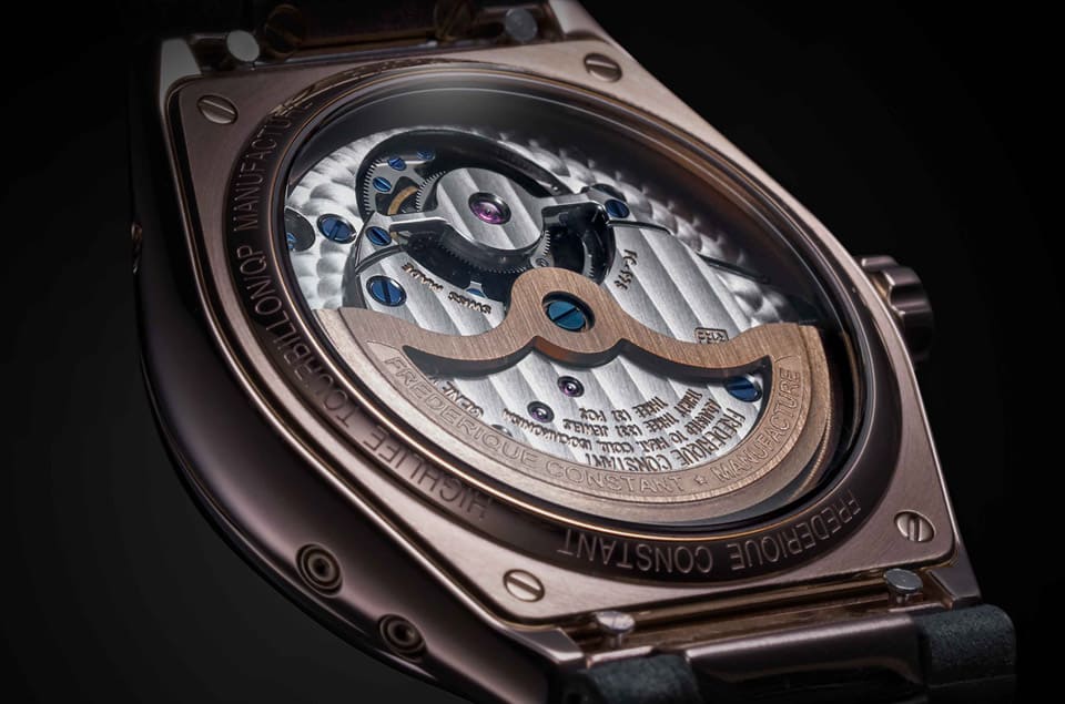 ▲錶背可見結構複雜的FC-975自動機芯,其機板與底板都經過進一步修飾,發揮高級製錶本色。