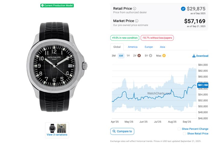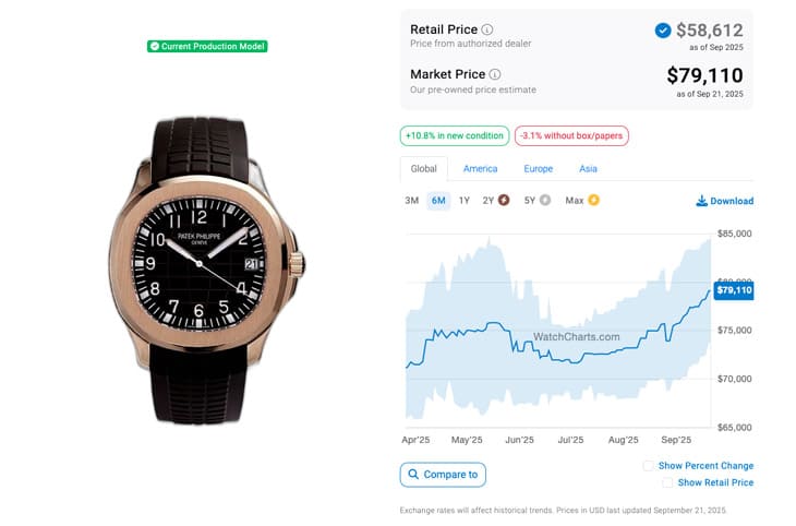 根據高級手錶市場調查研究機構WatchCharts的資料,上述Aquanaut系列人氣作品的二級市場行情在2025年3月左右分別是5167A:51,604美金(約合台幣156萬6)、5167R:71,154美金(約合台幣216萬)、5168G-001:72,330美金(約合台幣219萬5)、5968A:114,827美金(約合台幣348萬5)和5968G-010:109,805美金(約合台幣333萬3),每一款比起定價都高滿多的,由此可知在2022年第一季尾聲時手錶行情曾經衝到的巔峰狀態有多驚人,使它們經歷三年來的價格下滑期之後,超定價情況還是顯而易見。