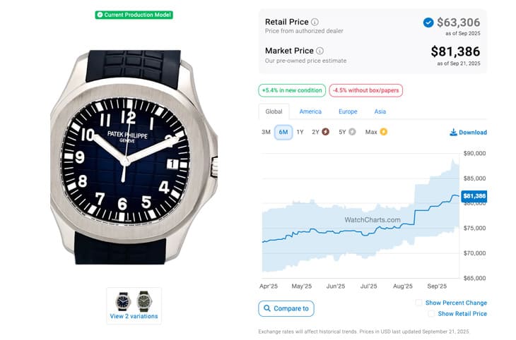 從那時起到現在又過了半年,同樣從WatchCharts公佈的資料中我們發現Aquanaut系列這些人氣作品的行情曲線意外地多數都有止跌回升的跡象,雖然半年來手錶的行情總是會有些起伏,可是以最新的市場報價而言,與半年前的行情一比,這五款中呈現上漲狀態的高達八成。