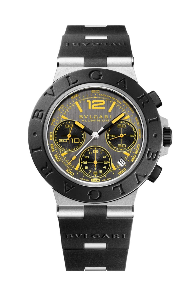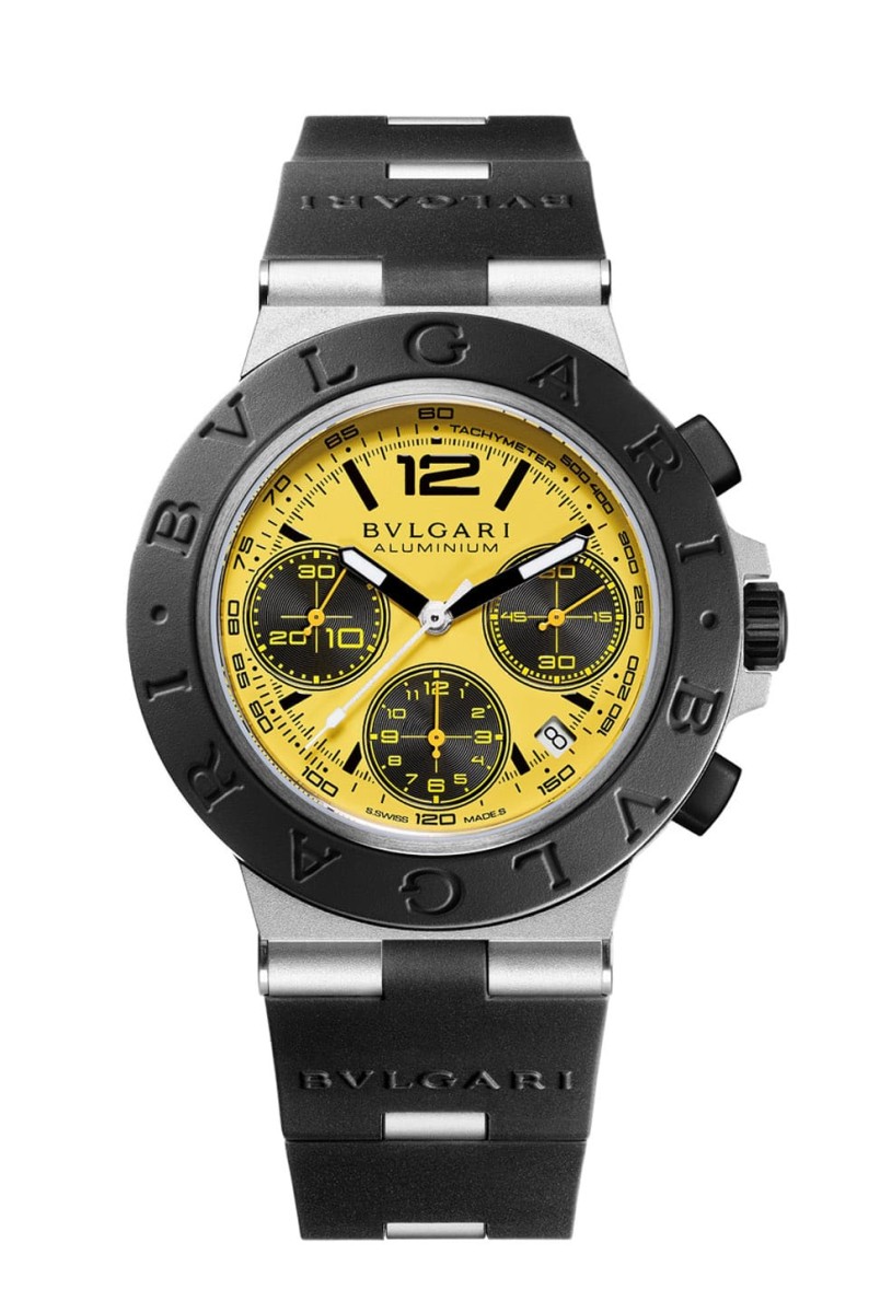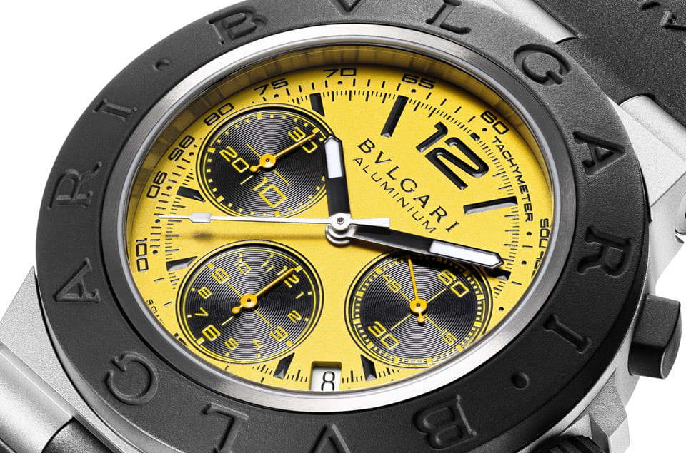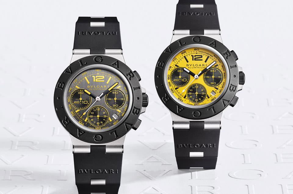 寶格麗推出的兩款Aluminium x Gran Turismo特別版計時碼錶分別採用黃色面盤/黑色刻度與時標,以及碳灰色面盤/黃色刻度與時標,兩款的小錶盤同為黑底黃色細節,其中黑色面盤款的計時大秒針整枚都是銀白色、時分指針的夜光塗層為白色,而黃色面盤款的計時大秒針則是在銀白針身的尖端塗上黃色,對應時分指針的夜光塗層也改為黃色,其中黃色面盤款的限量數為500只、碳灰色面盤款的限量數相對多一點來到1200只。